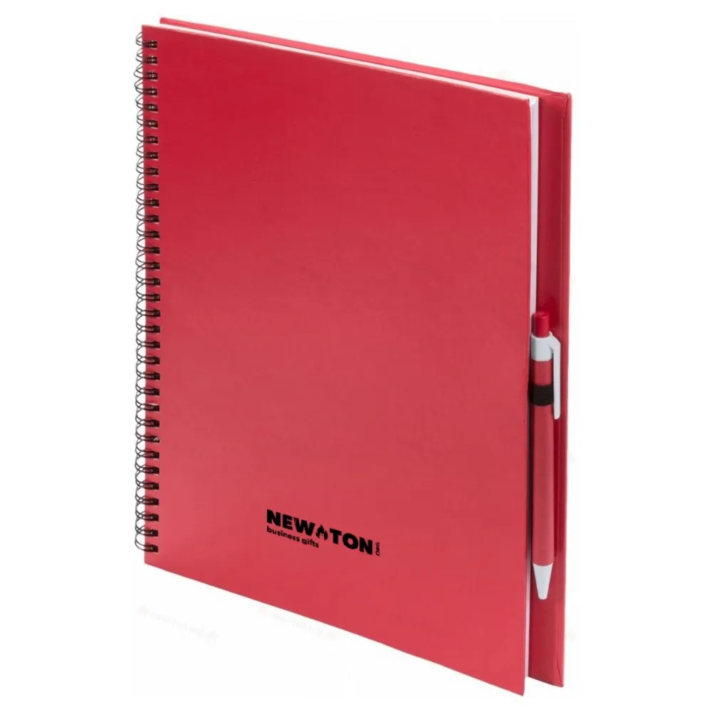 Спиральный блокнот в картонной обложке с 80 пустыми листами и шариковая ручка из переработанной бумаги с синим стержнем, формата А4.