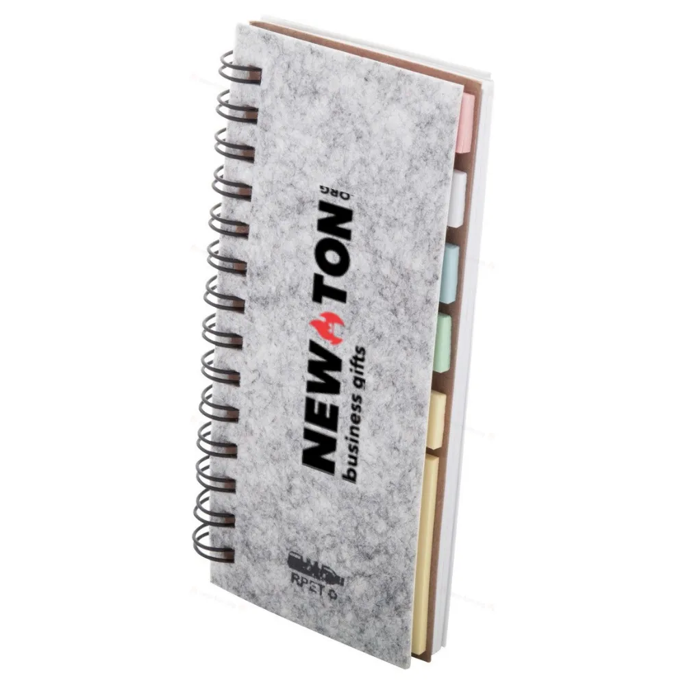 Спиральный блокнот с обложкой из переработанной бумаги, содержащая 40 линейных листов из переработанной бумаги, 25 самоклеящихся заметок и 125 закладок (в 5 разных цветах).