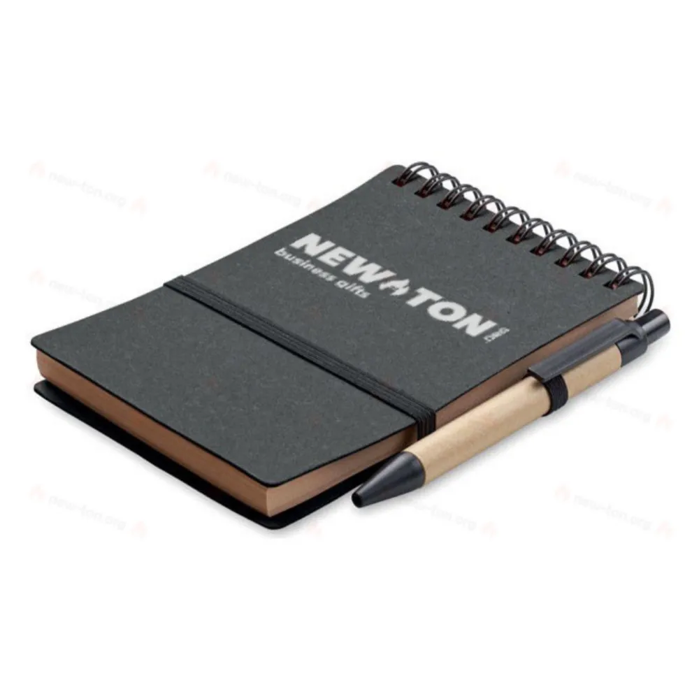 Блокнот в обложке из 70% переработанной бумаги и 30% полиуретана. Двойная проволока. 140 линованных страниц из переработанной бумаги (70 листов). Кнопочная шариковая ручка из переработанной бумаги и пластика. Синие чернила. Эластичный ремешок и держатель для ручки. FSC®-certified | FSC MIX CREDIT, P7.1, FSC-C213206