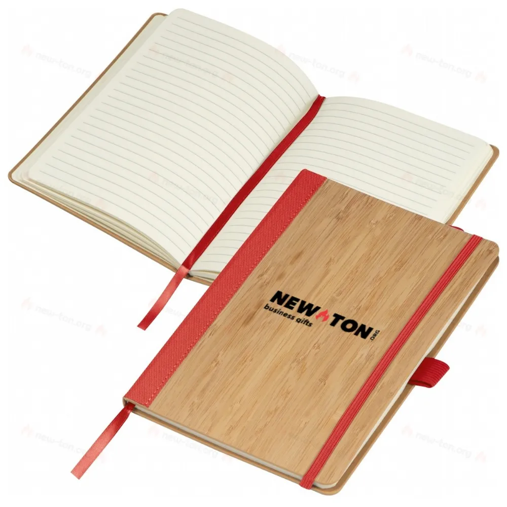 Блокнот с обложкой из бамбука и переработанным полиэстером на обороте. В блокноте 192 страницы в линованной обложке, ленточная закладка и петелька для ручки.