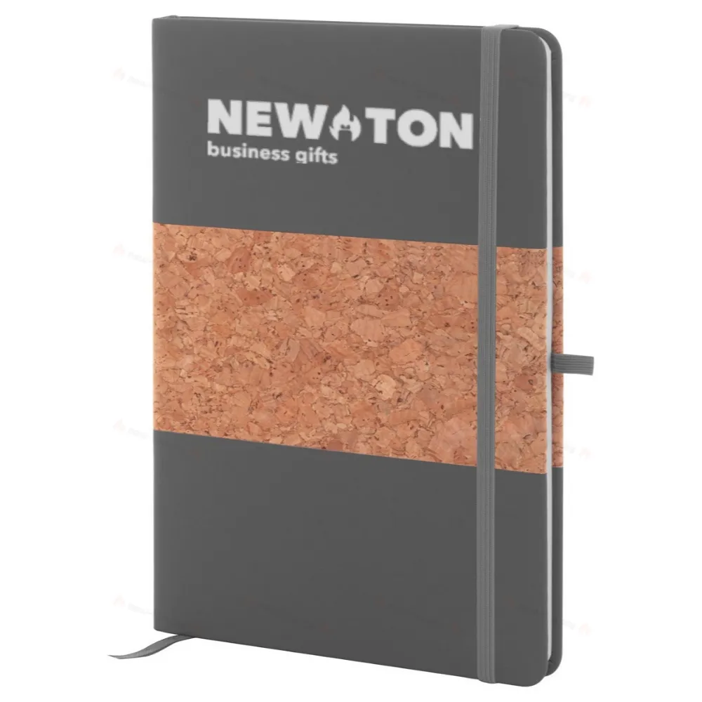 Блокнот с обложкой из натурального пробкового материала и переработанной кожи PU с закладкой, резинкой и держателем для ручки в тон. Внутри 80 линованных листов из переработанной бумаги. Размер A5.