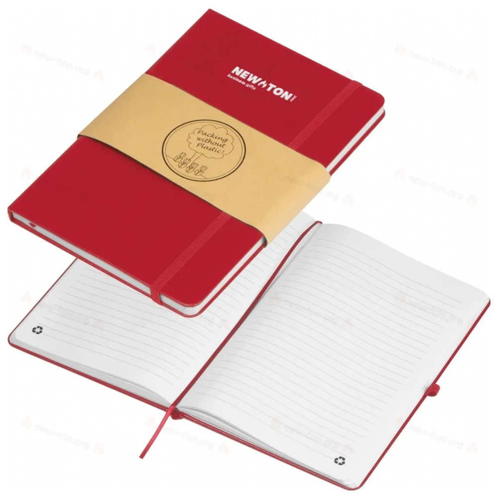 Наш блокнот из переработанного полиуретана с 192 линованными страницами из переработанной бумаги, эластичной лентой для закрытия и петлей для ручки.