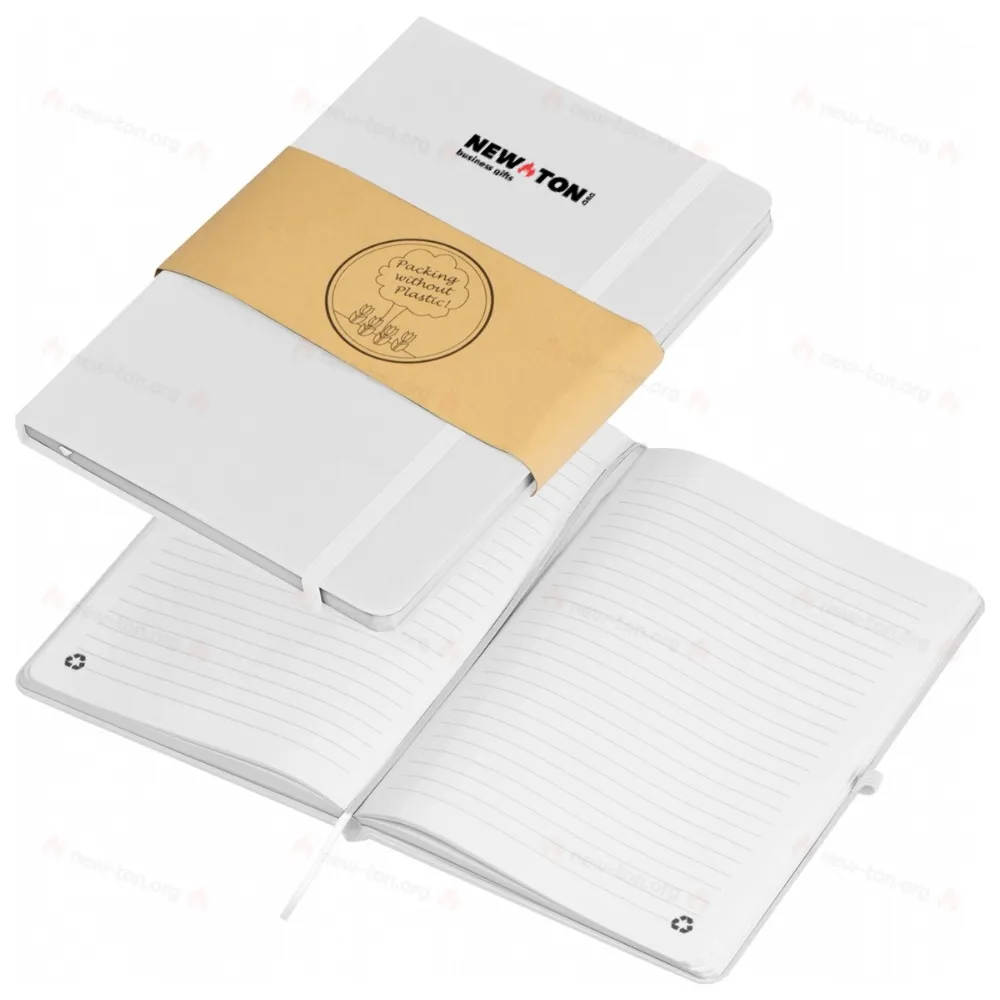 Наш блокнот из переработанного полиуретана с 192 линованными страницами из переработанной бумаги, эластичной лентой для закрытия и петлей для ручки.