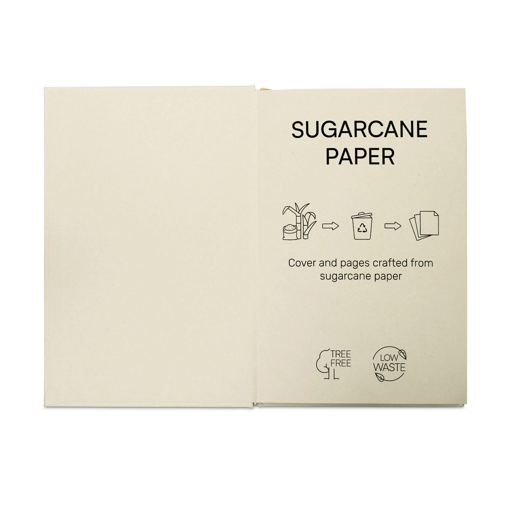 Блокнот формата А5 в твердом переплете из бумаги сахарного тростника (80% сахарного тростника). Внутренняя часть содержит 160 линованных страниц из бумаги сахарного тростника (80% сахарного тростника) (90 г/м2), ленту и резинку для закрытия блокнота. 147 x 216 мм