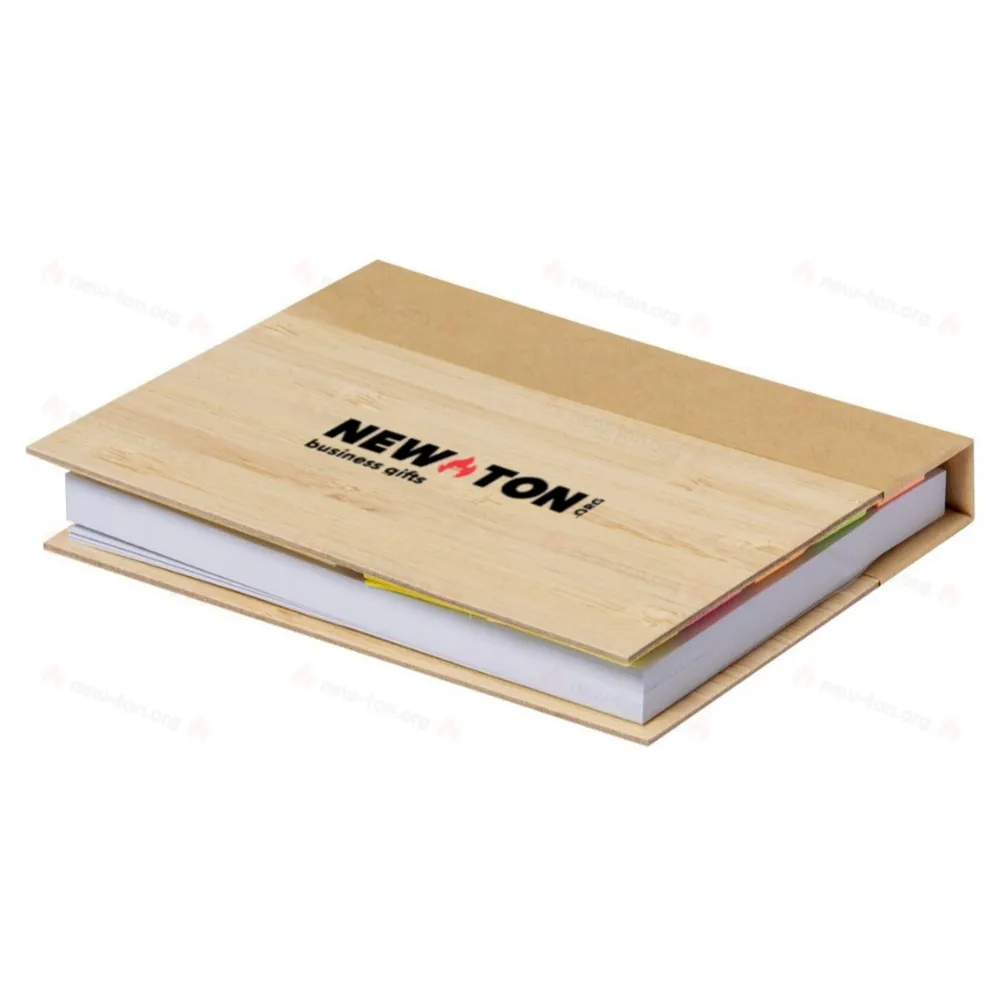 Блокнот с обложкой из бамбука, включающий 70 листов, 25 самоклеящихся заметок и 125 закладок (в 5 разных цветах).