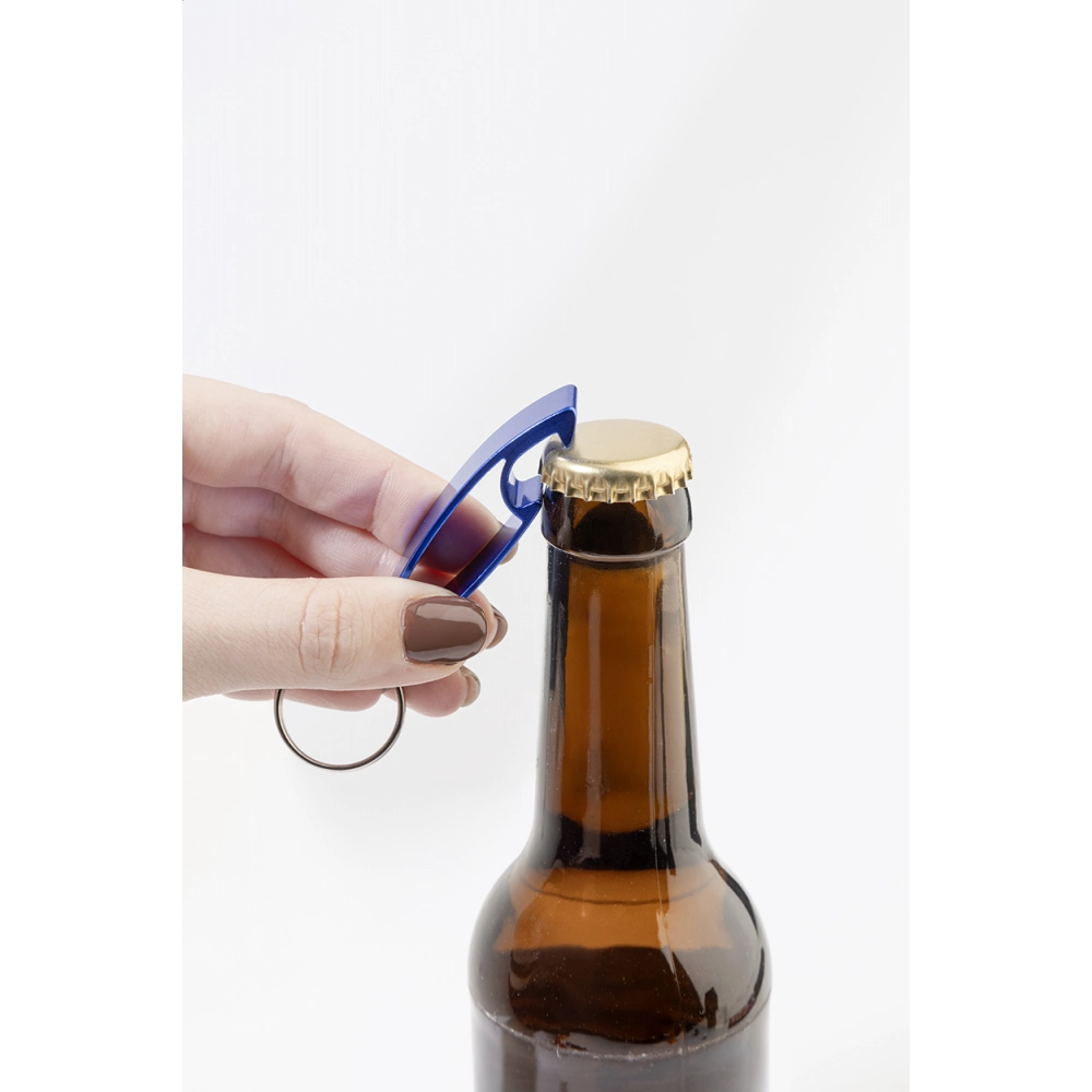 Переработанный бутылочный открывалка из алюминия с металлическим кольцом для ключей.