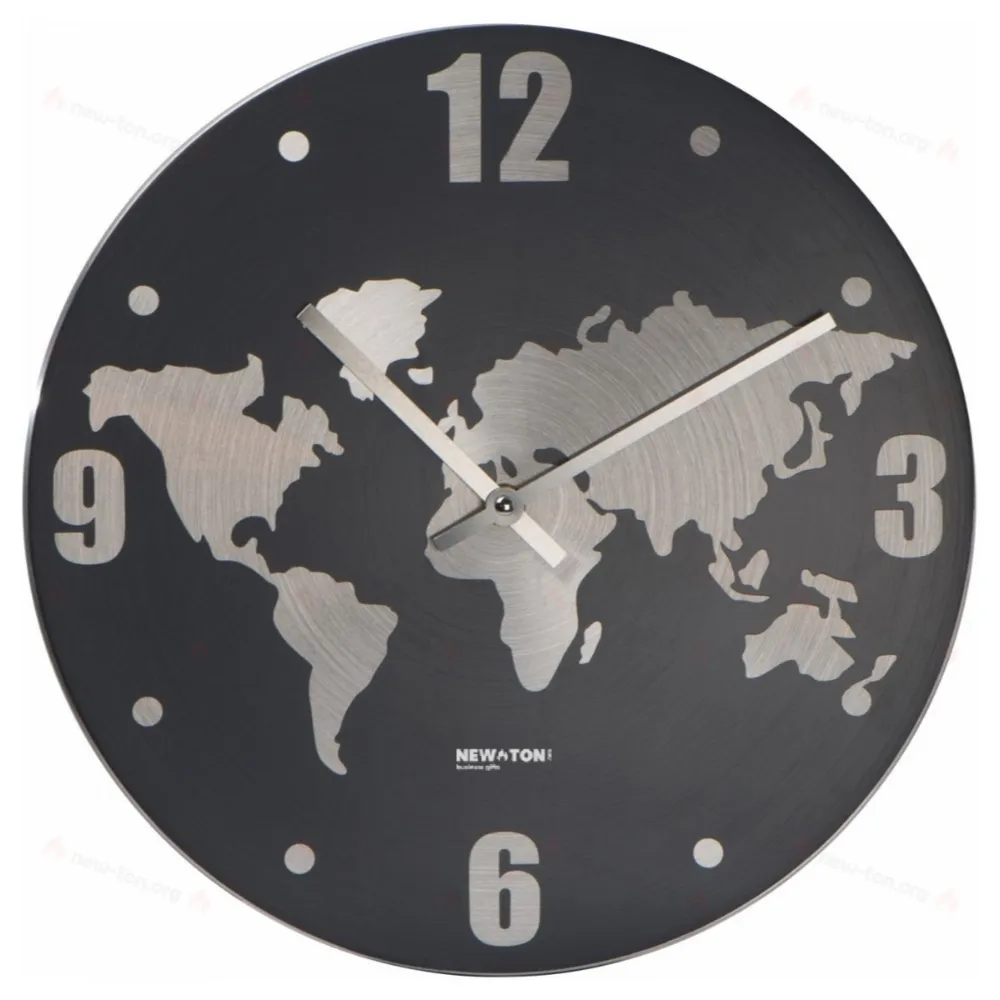 Настенные часы из алюминия с декоративной картой мира на циферблате. Логотип можно разместить непосредственно на изделии.