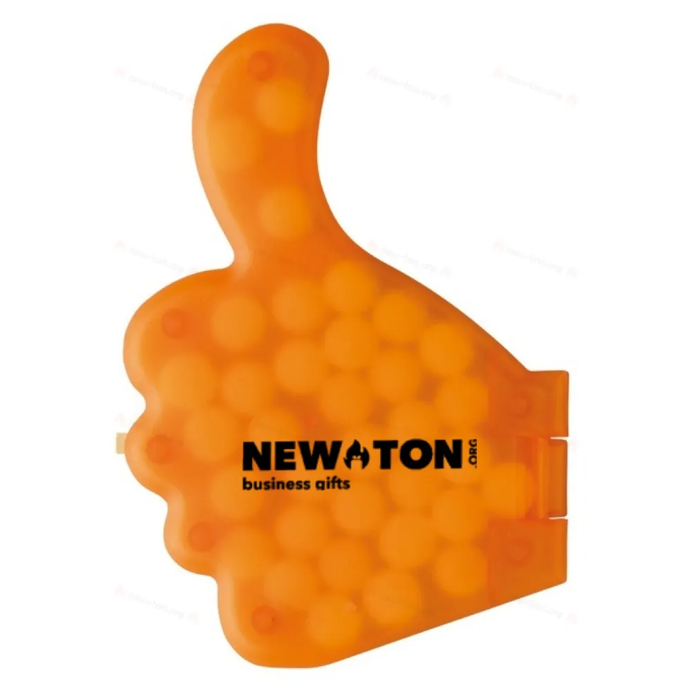 Дозатор мяты перечной в форме большого пальца. Открытие дозатора на запястье. Примерно пять граммов мяты без сахара. Подходит для полноцветной цифровой печати. Недурно!
