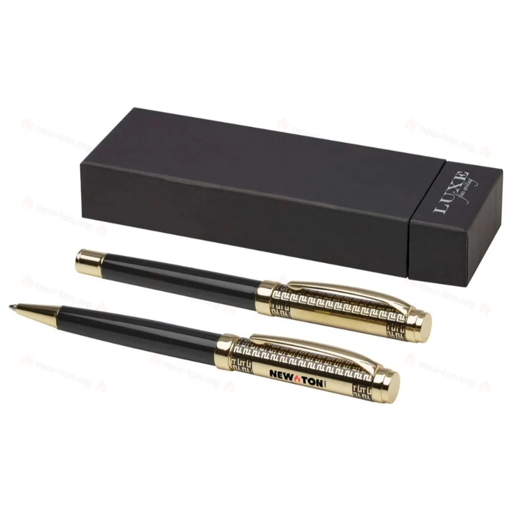 Набор ручек Legato представляет собой элегантное сочетание шариковой и роллерной ручек. Обе ручки имеют верхнюю часть корпуса из переработанной латуни с золотым хромированным покрытием, нижнюю часть корпуса с черным напылением, металлические аксессуары с золотым хромированным покрытием, логотип LUXE на средней части и синюю чернила. Шариковая ручка имеет длину письма 800 метров и размер пера 1,00 мм. Роллерная ручка имеет длину письма 400 метров и размер пера 0,7 мм.