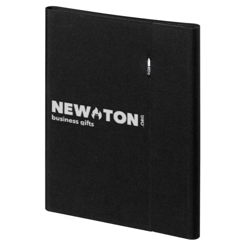 Папка для документов из полиэстера 600D RPET формата А4 с магнитной застежкой, складным мобильным держателем и блокнотом на 20 листов с подкладкой. С отличительной этикеткой RPET.