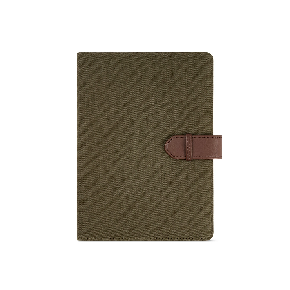 Наша экологичная папка формата A5 из переработанного хлопкового полотна оснащена удобной застежкой на кнопке из переработанного ПУ, блокнотом на 64 страницы в точку (70 г/м²), карманом для телефона, двойным держателем для ручек и слотами для карт. Создана с учетом устойчивости, она станет вашим стильным спутником на пути к успеху.