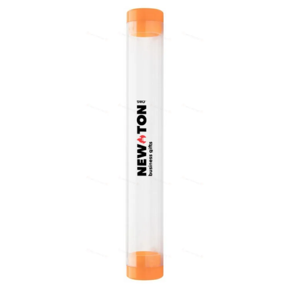 Прозрачный пластиковый тубус для ручек с цветными колпачками.