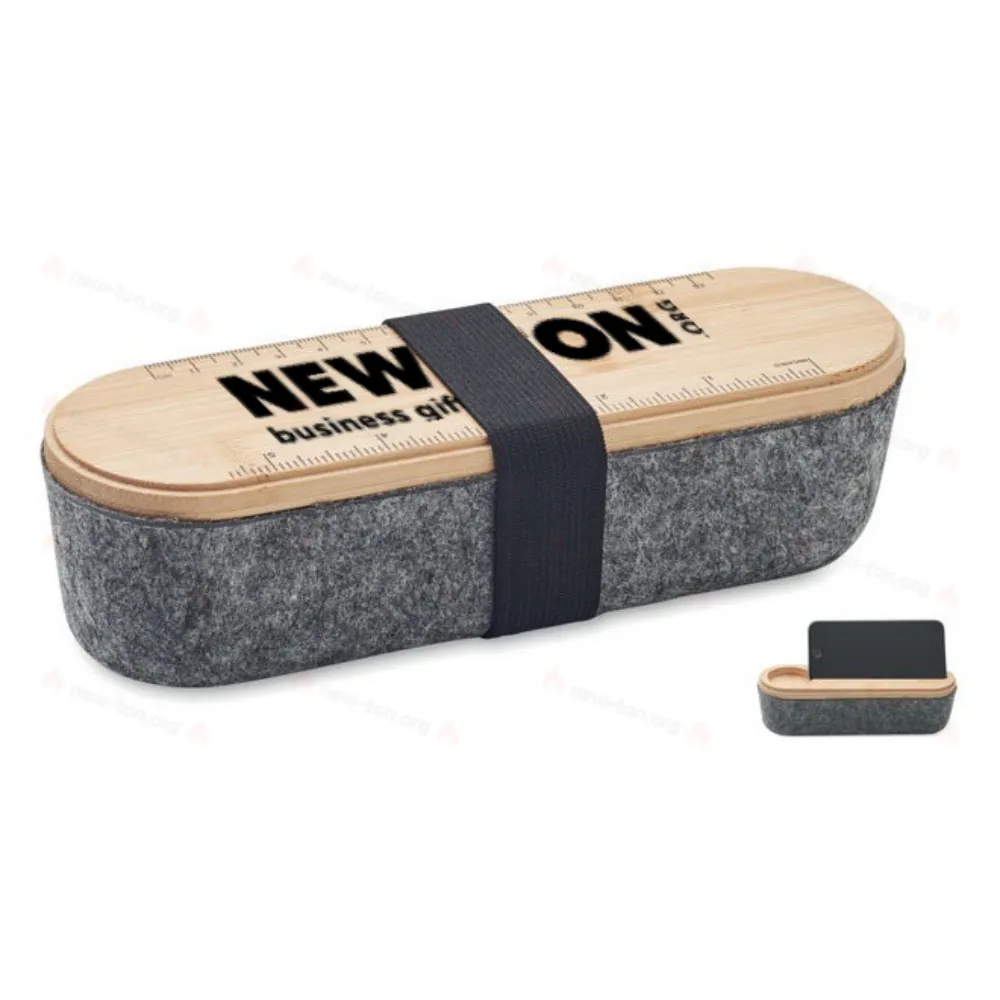 Пенал из переработанного войлока RPET с бамбуковой крышкой и встроенным держателем для телефона. Линейка: 5,5 дюйма и 13,5 см. Закрывается на эластичный ремешок.