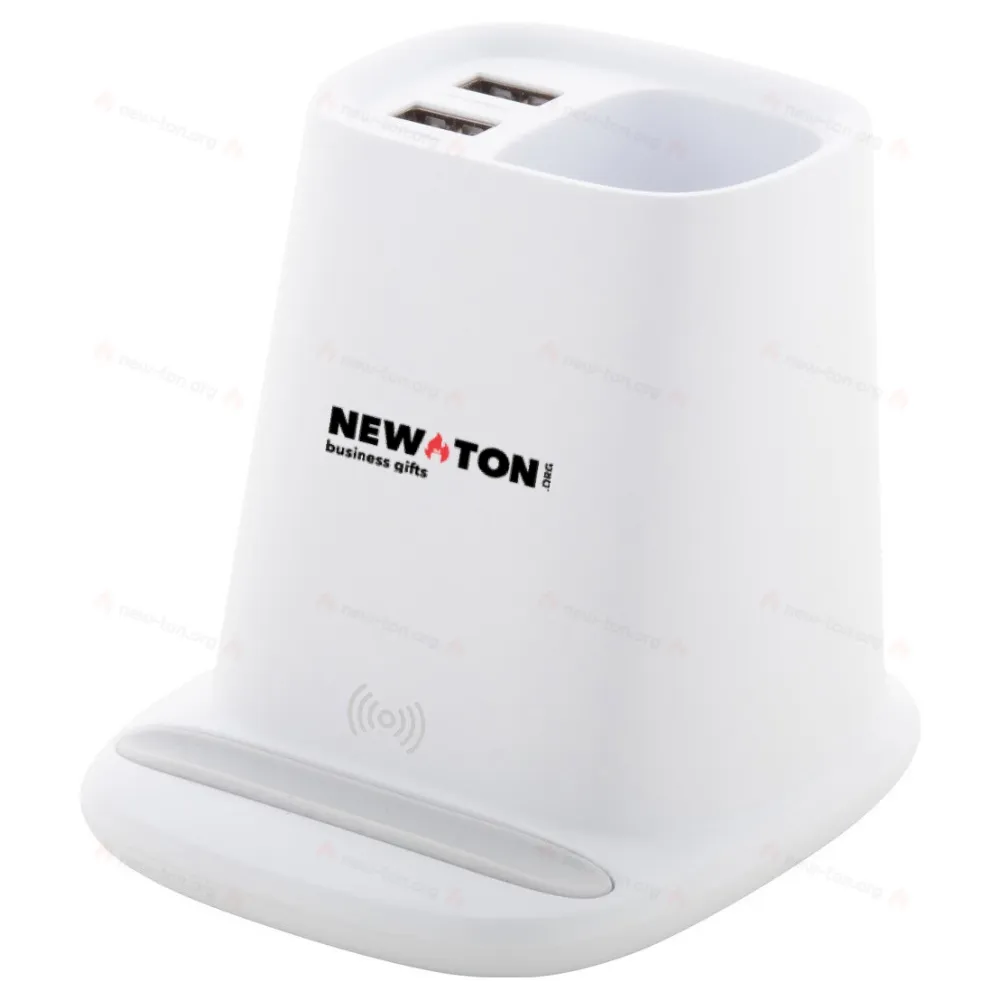 Многофункциональный настольный держатель для ручек из пластика с держателем для телефона, встроенным беспроводным быстрым зарядным устройством (10 Вт) и 2 портами USB-зарядного устройства (максимальная мощность 2000 мА). Включая USB-кабель для зарядного устройства.