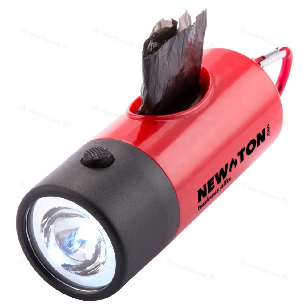 Пластиковый диспенсер для собачьих отходов с 1 светодиодным фонариком, 15 пакетами и алюминиевым карабином. С кнопочными батарейками.