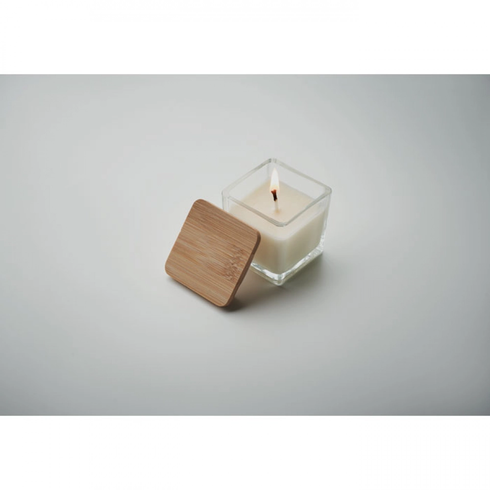 Ароматизированная восковая свеча на растительной основе в квадратном стеклянном держателе с бамбуковой крышкой. 50 гр. Время горения: 8 часов.