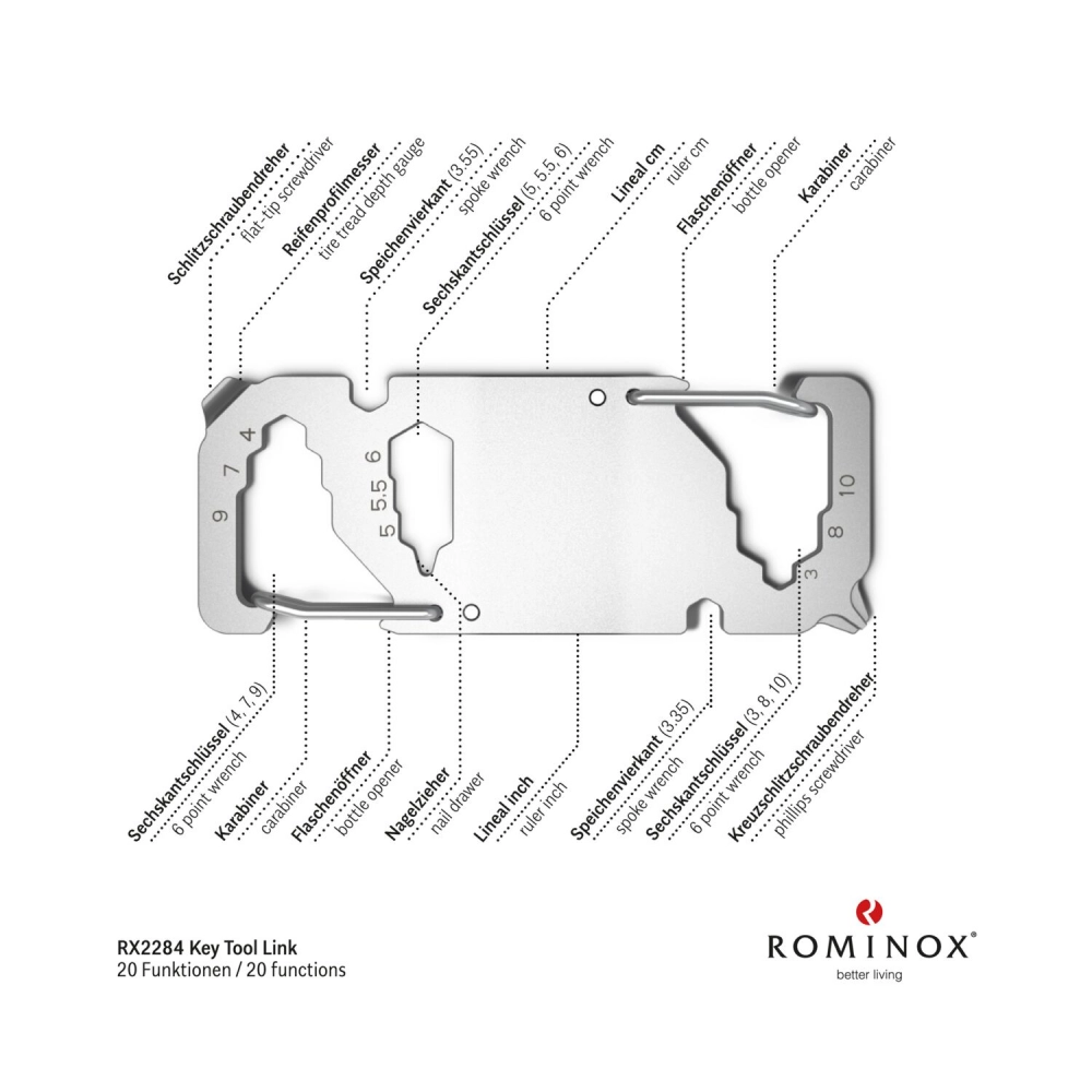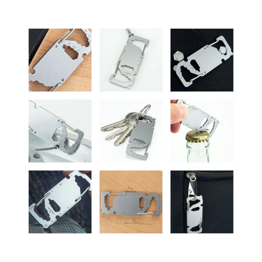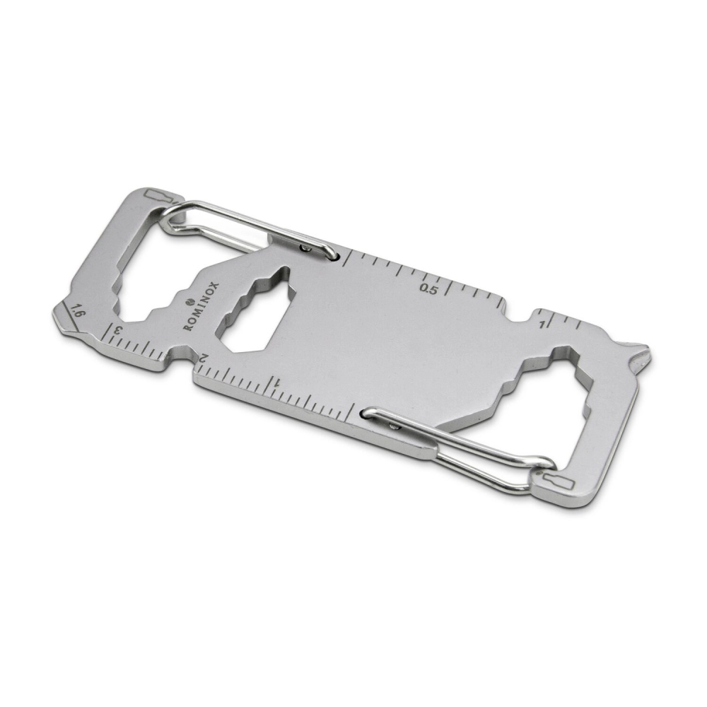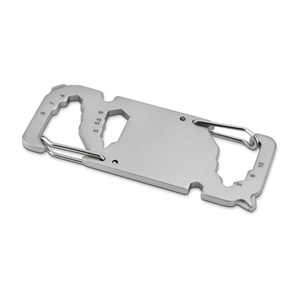 Многофункциональный инструмент (из прочной нержавеющей стали) для вашего брелка с описанием функций и стандартной картонной упаковкой. 20 функций: 9 шестигранных ключей, 2 гаечных ключа для спиц, 2 карабина, 1 плоская отвертка, 1 гвоздодер, 1 крестовая отвертка, 1 открывалка для бутылок, 1 сантиметровая линейка, 1 дюймовая линейка, 1 глубиномер протектора шин (1,6 мм).