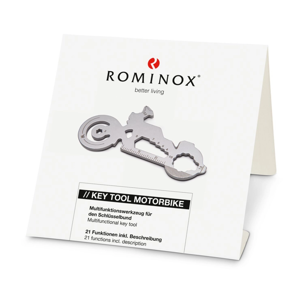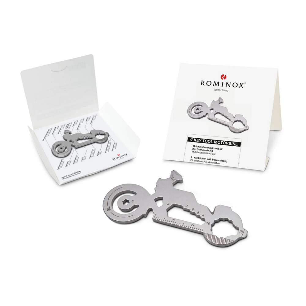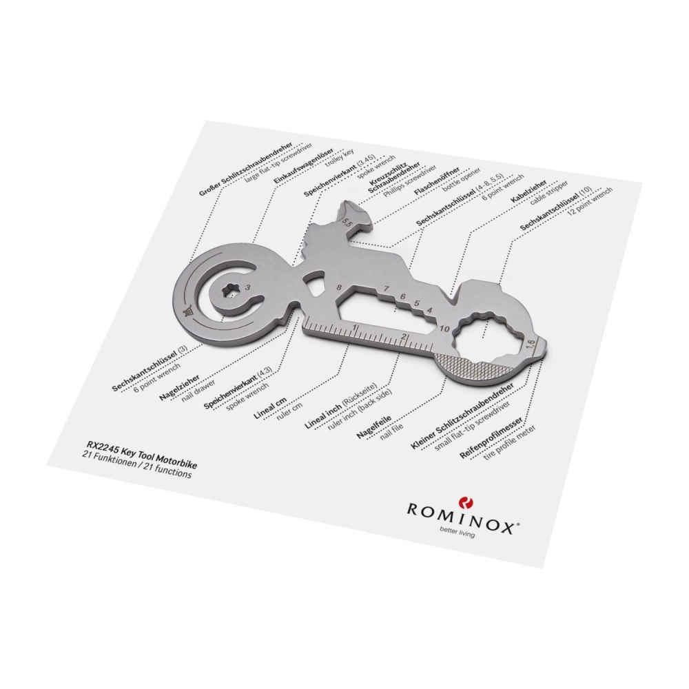 Многофункциональный инструмент (из прочной нержавеющей стали) для вашего брелка, включая описание функций и стандартную картонную упаковку. 21 функция: 8 шестигранных ключей, 2 угольника для спицы, 2 плоские отвертки, 1 гвоздодер, 1 крестовая отвертка, 1 кабельный резак, 1 открывалка для бутылок, 1 сантиметровая линейка, 1 дюймовая линейка, 1 глубиномер протектора (1,6 мм), 1 пилочка для ногтей, 1 приспособление для снятия тележек.
