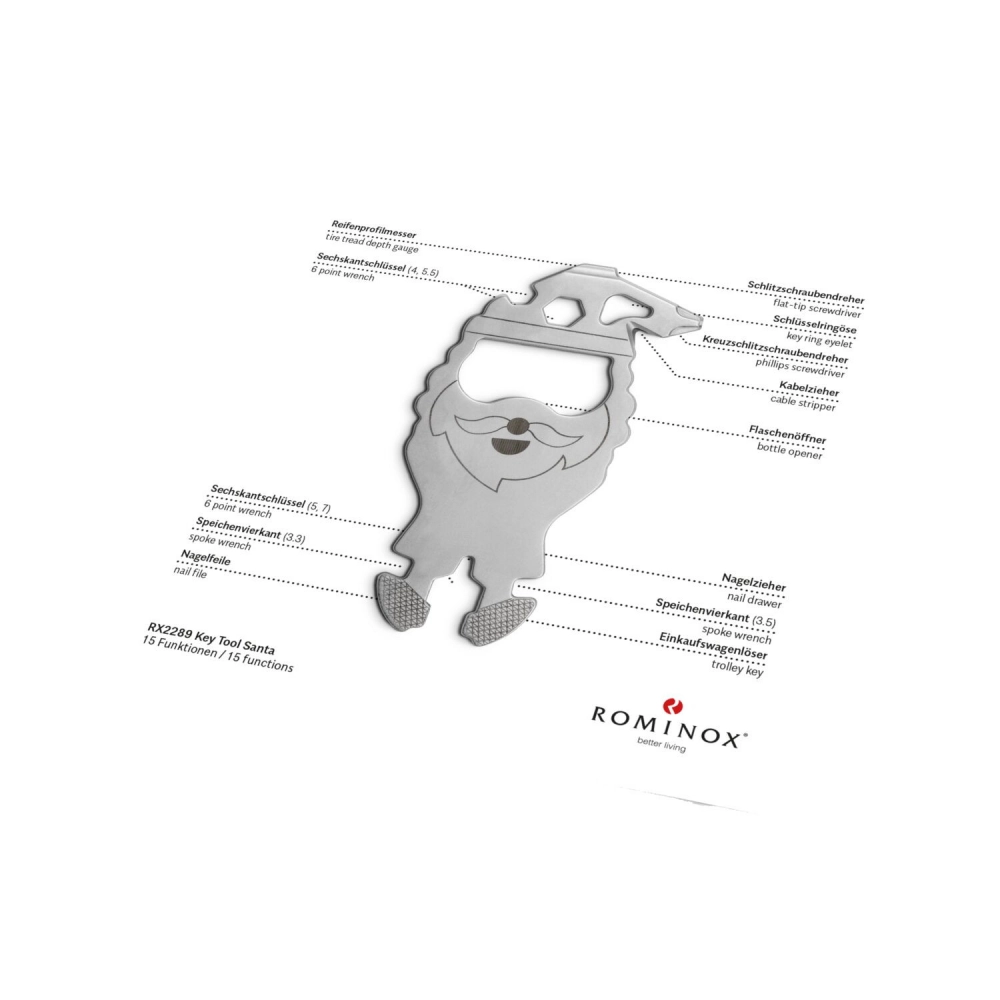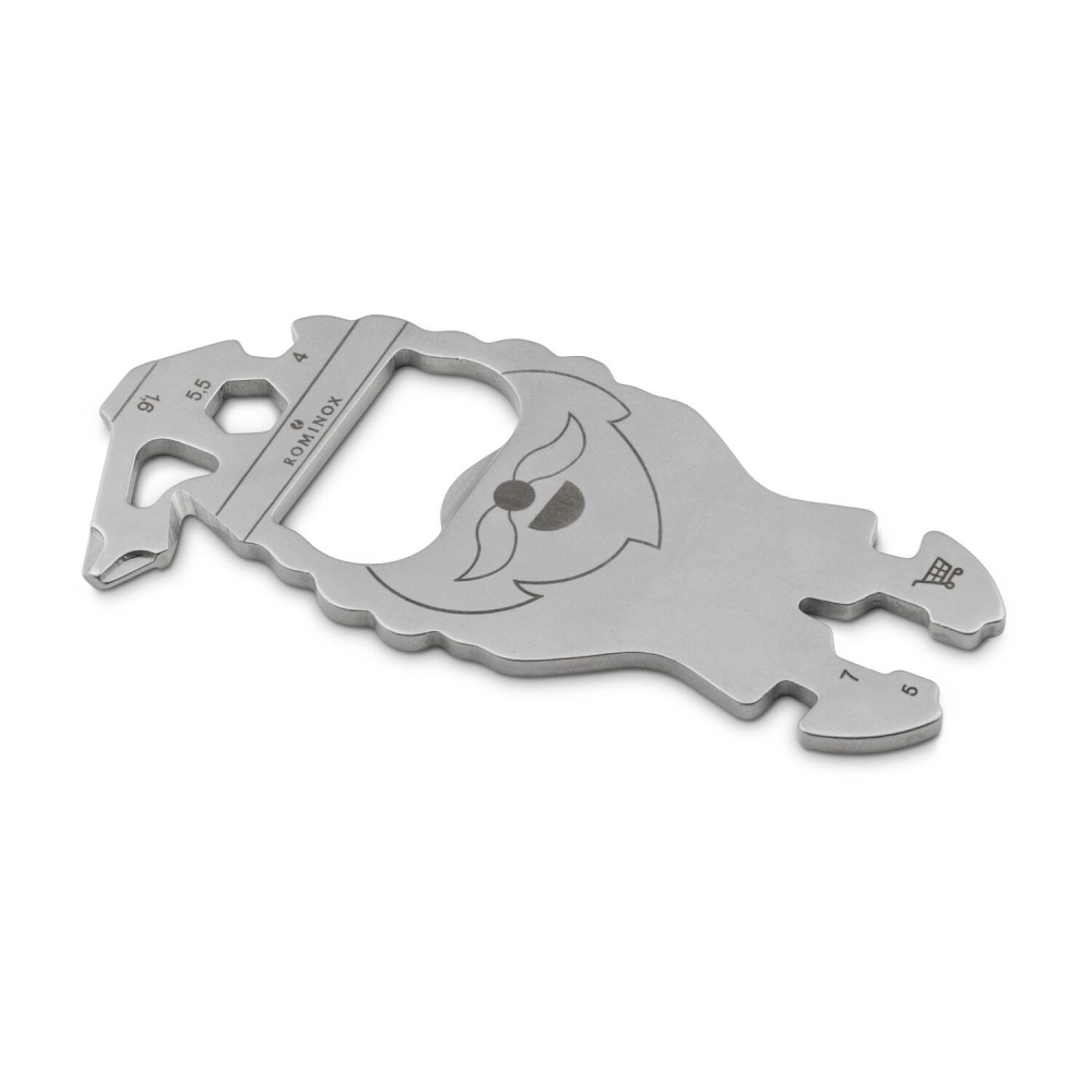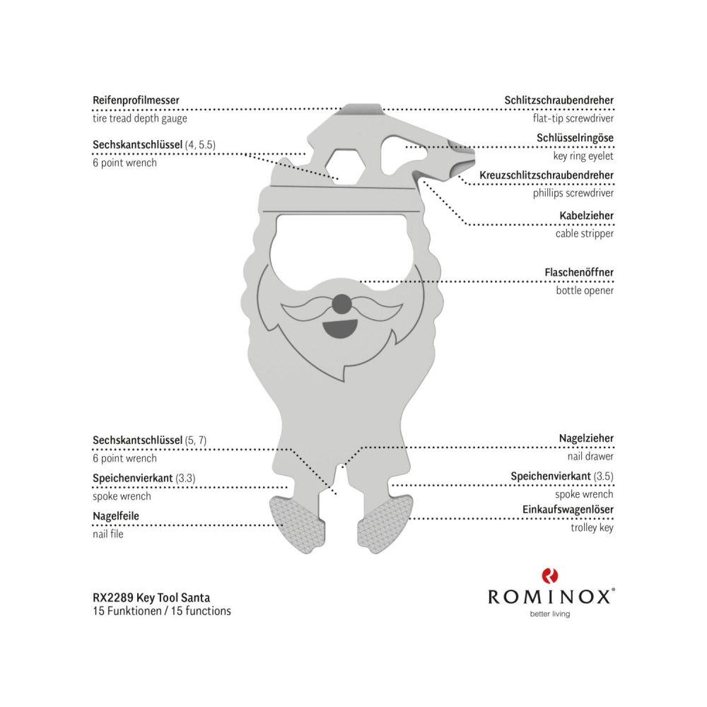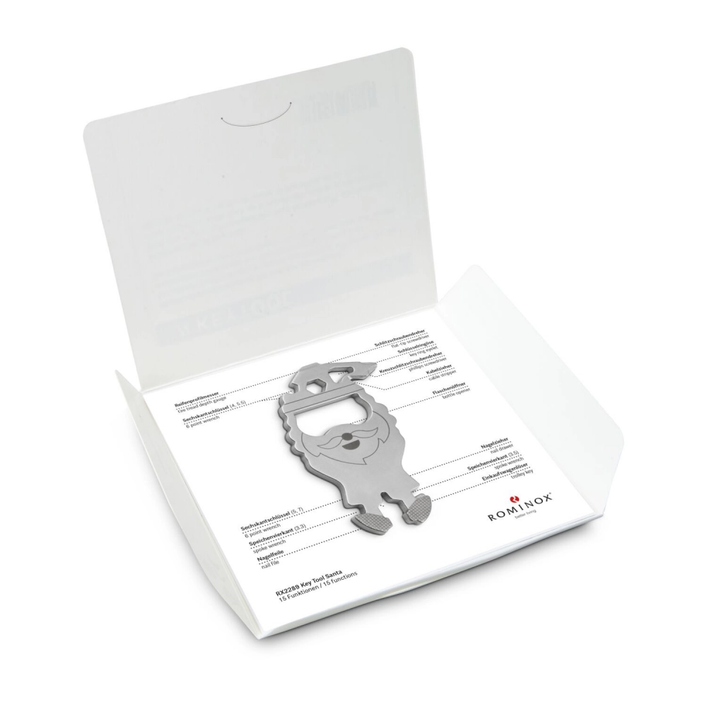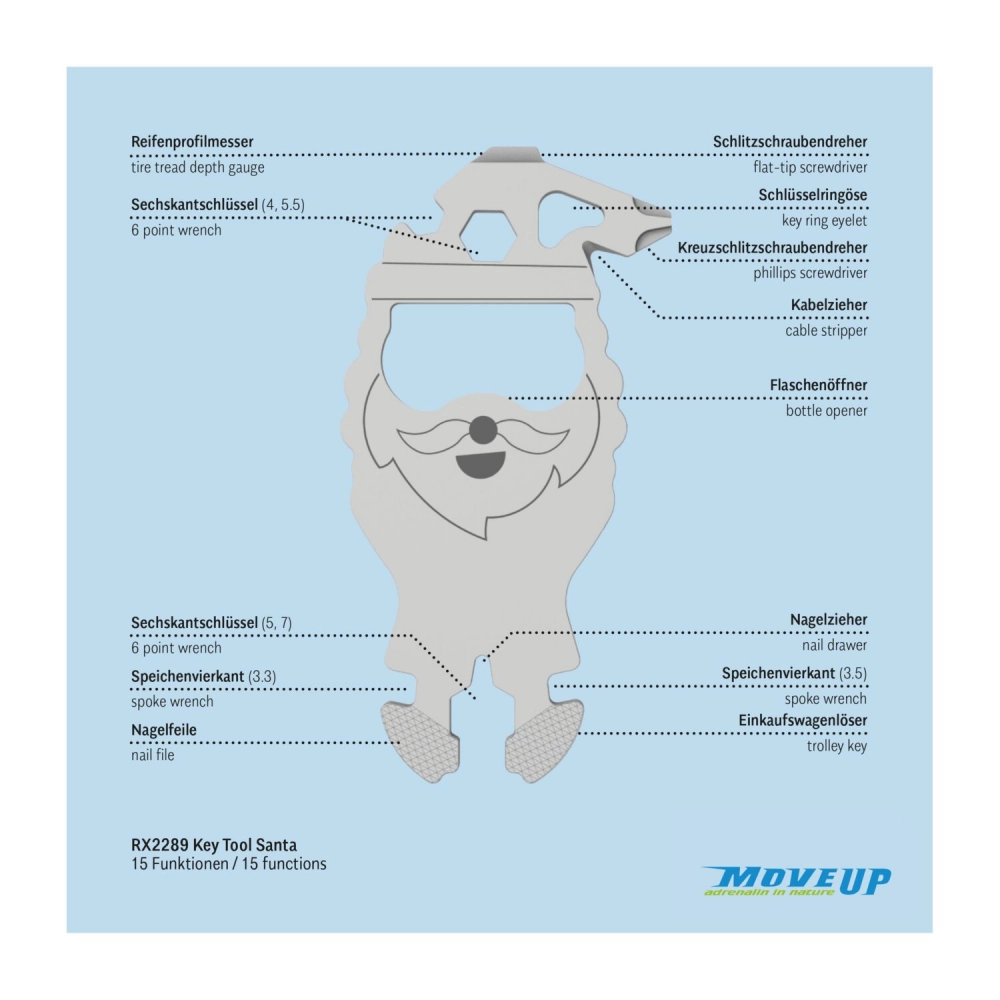 Многофункциональный инструмент (из прочной нержавеющей стали) для вашего брелока, включая описание функций и стандартную картонную упаковку. 15 функций: 4 шестигранных ключа, 2 гаечных ключа для спиц, 1 плоская отвёртка, 1 гвоздодёр, 1 инструмент для снятия тележек, 1 крестовая отвёртка, 1 инструмент для протяжки кабеля, 1 открывалка для бутылок, 1 глубиномер протектора (1,6 мм), 1 пилочка для ногтей и 1 люверс.