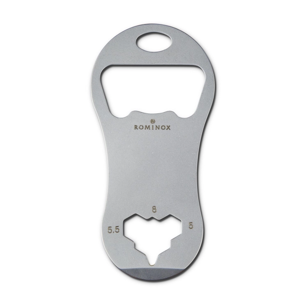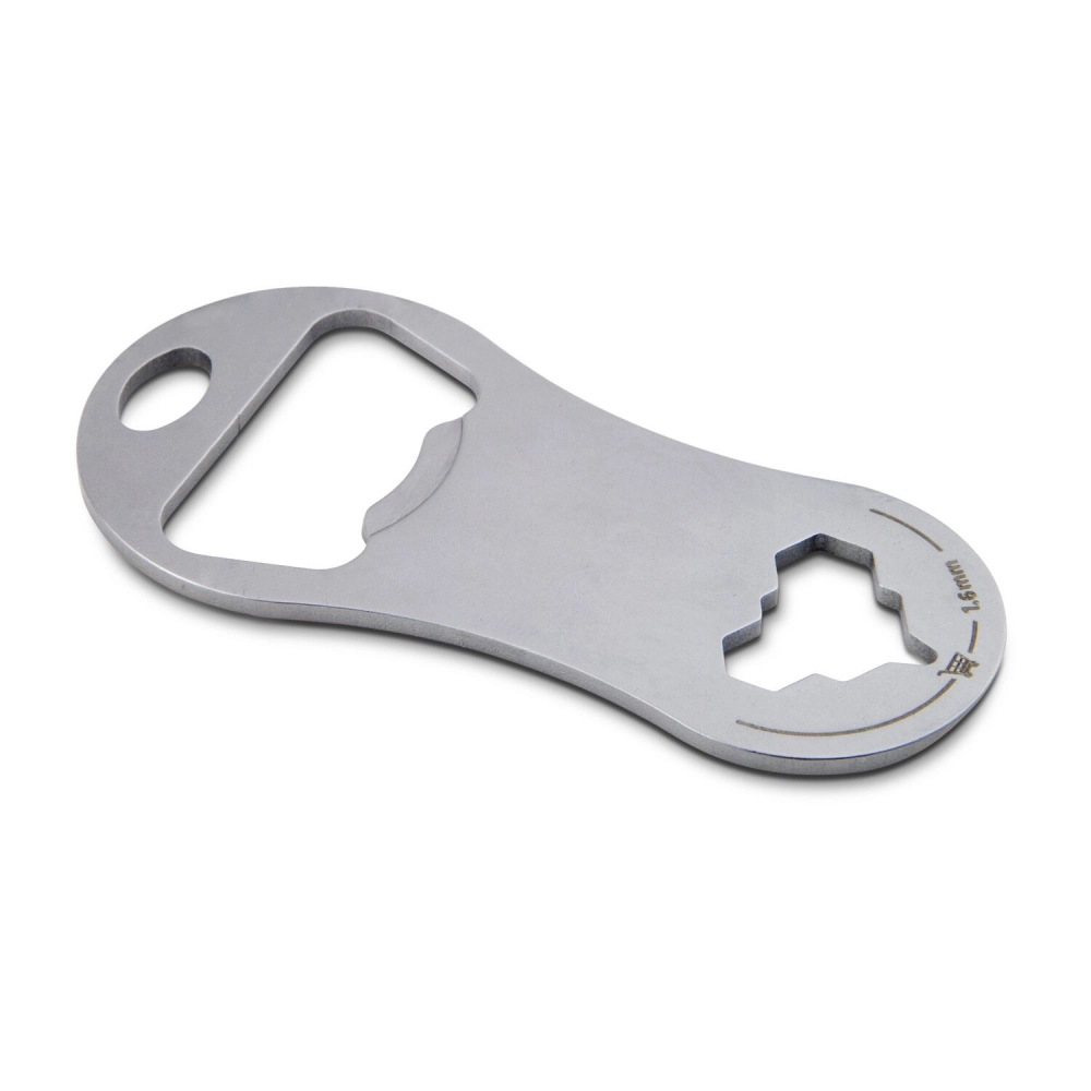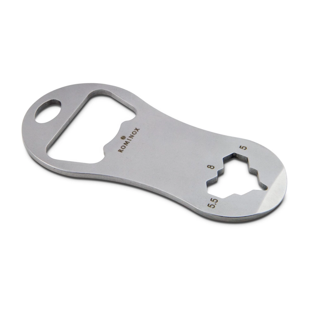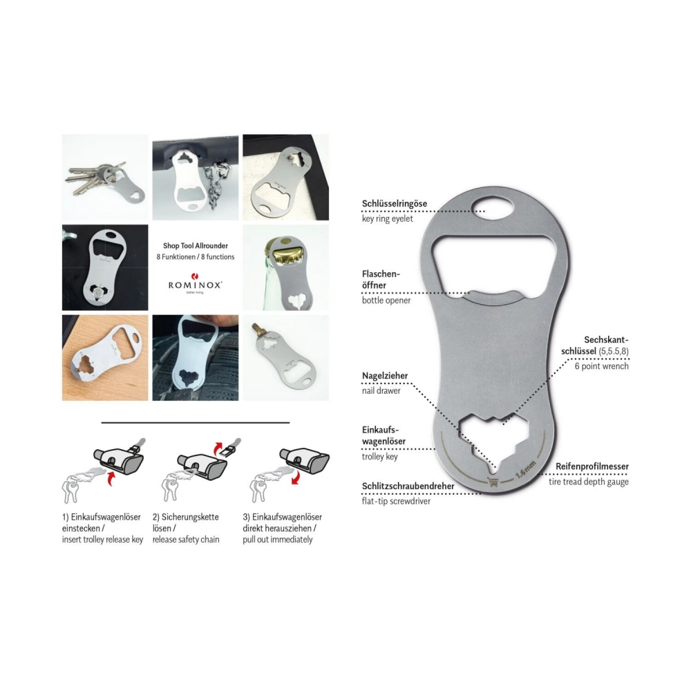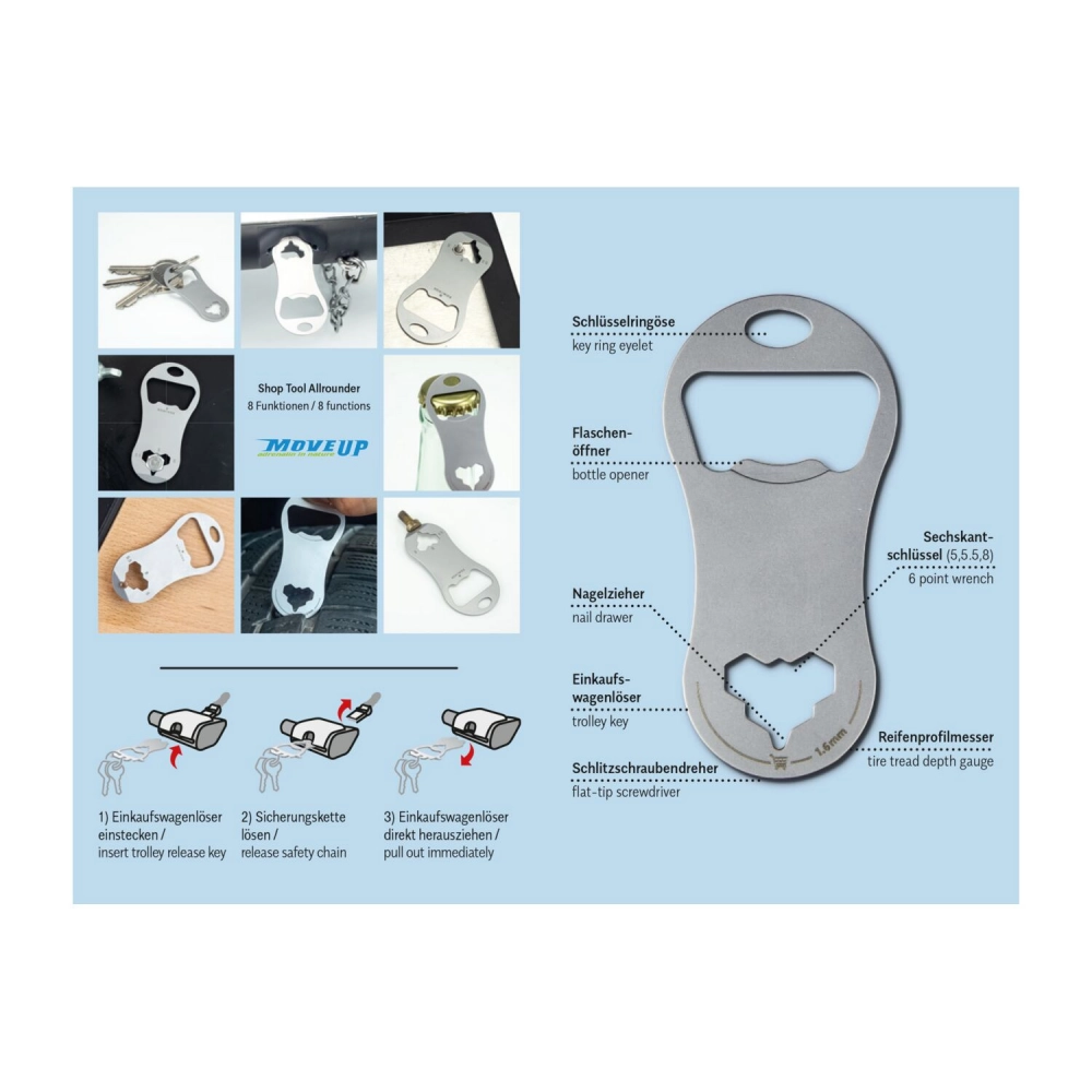 Прочная инструментальная сталь, включая функциональное описание и стандартную картонную упаковку. 8 функций: 1 съёмник для мастерской, 1 открывалка для бутылок, 1 плоская отвёртка, 1 глубиномер протектора (1,6 мм), 1 гвоздодер, 3 шестигранных ключа.