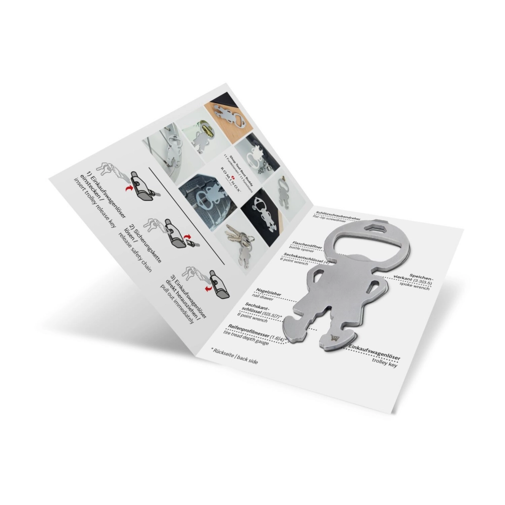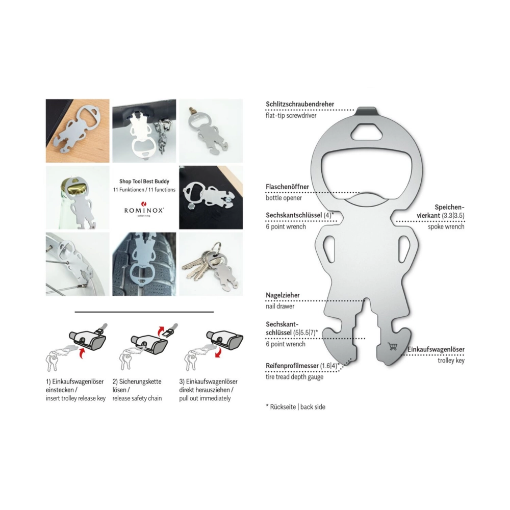 Прочная инструментальная сталь, включая описание функций и стандартную картонную упаковку. 11 функций: 1 фиксатор для супермаркета, 1 открывалка для бутылок, 1 плоская отвёртка, 1 глубиномер протектора (1,6 мм), 1 гвоздодер, 2 угольника для спиц, 4 шестигранных ключа.