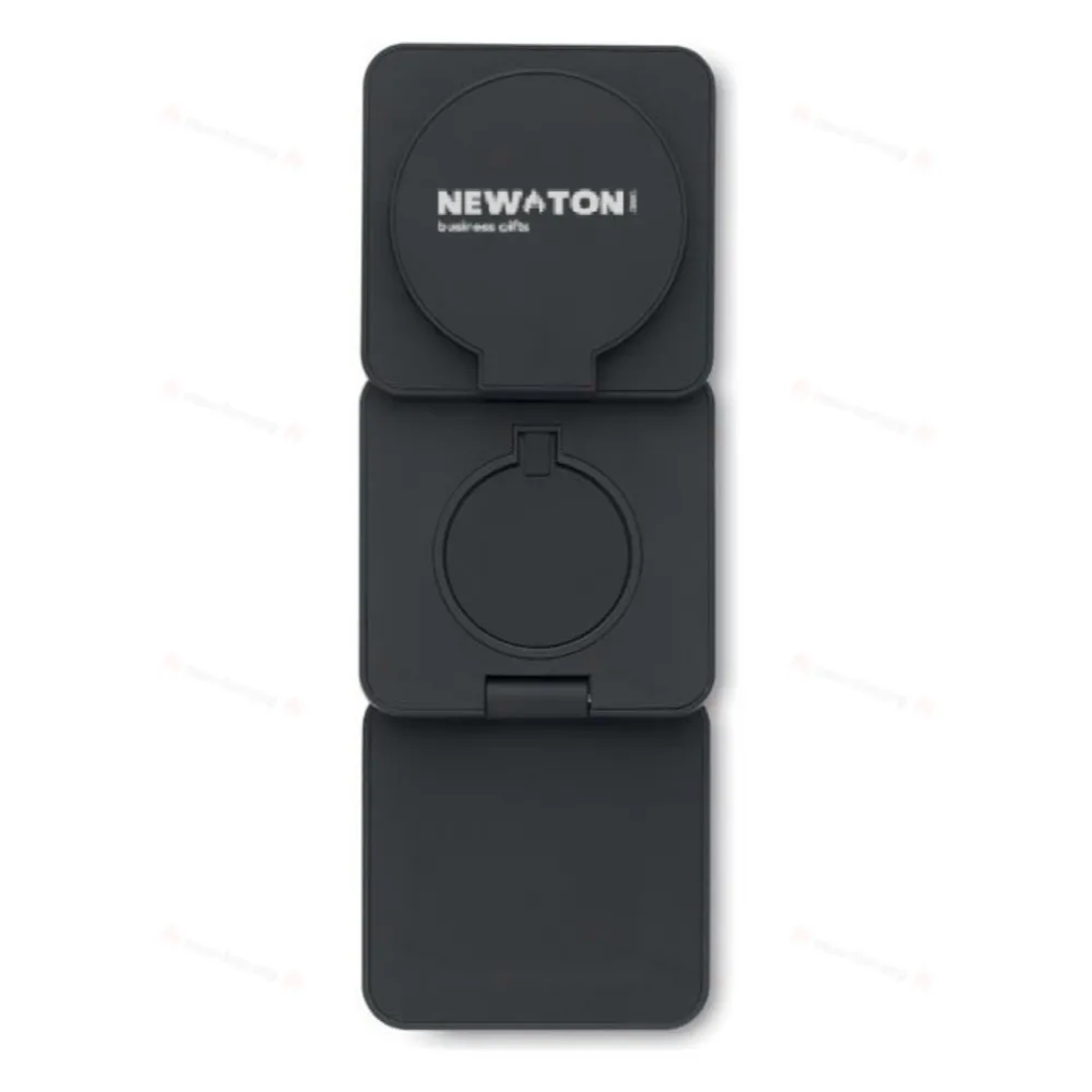 Складная зарядная станция 3 в 1 из прорезиненного переработанного пластика. Включает в себя магнитное беспроводное зарядное устройство мощностью 15 Вт, зарядное устройство для смарт-часов (только для Apple®) и наушников TWS.