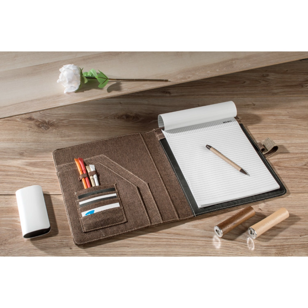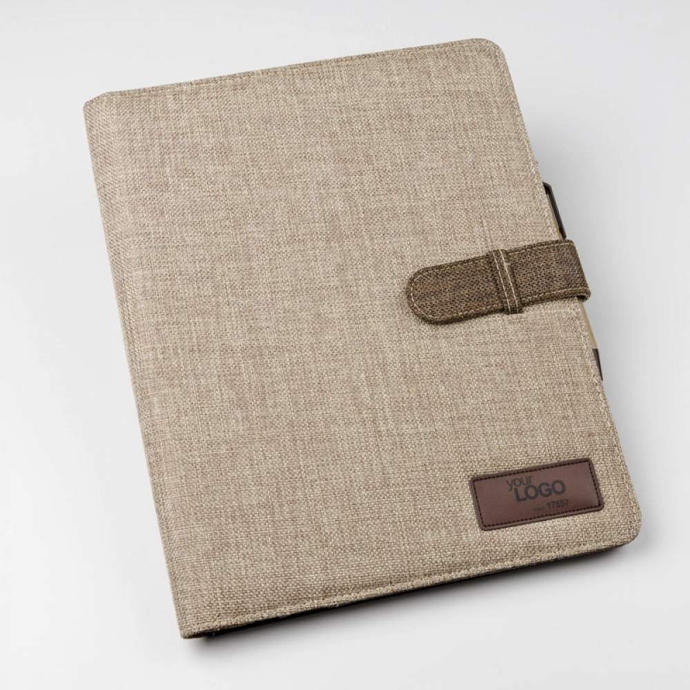 Эко-папка из хлопкового льна. Включает 2 больших кармана, 2 отделения для USB-накопителей, маленькие карманы, шариковую ручку и блокнот. Блокнот не приклеен к обложке, а просто вставлен в карман, что позволяет его заменить. Логотип может быть выгравирован на экокоже, вшитой в обложку.