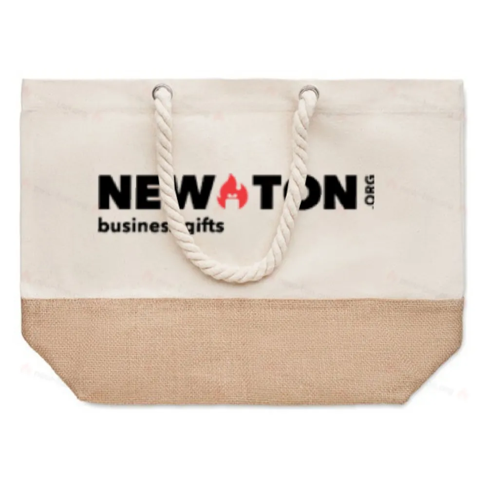 Пляжная сумка или сумка для покупок из хлопка с ручкой и джутовыми деталями. 280 гр/м².