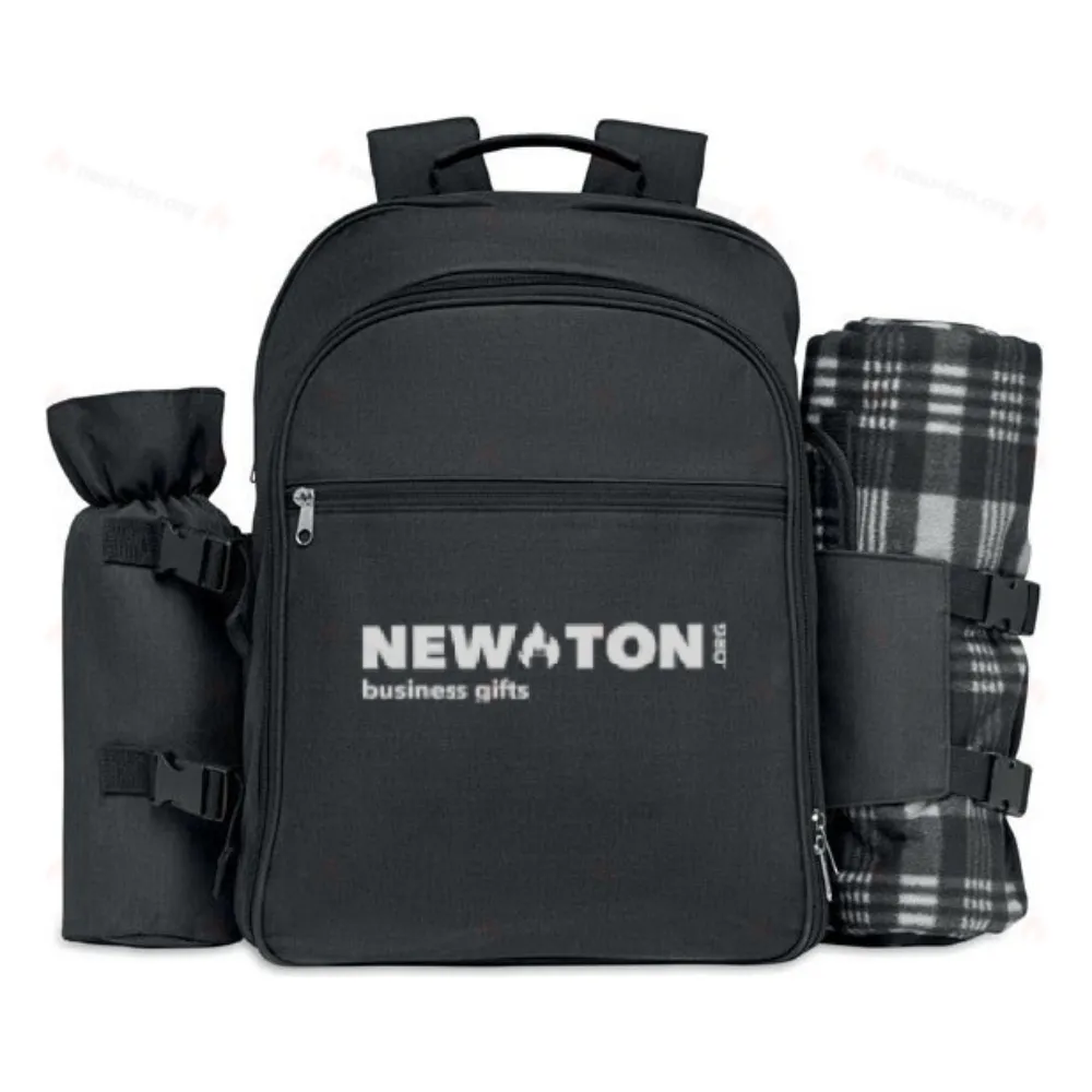 Рюкзак для пикника из катионного полиэстера RPET 300D на 4 человека с термо отделением для продуктов. Включает: высококачественные столовые приборы, штопор, разделочную доску, хлебный нож и плед.