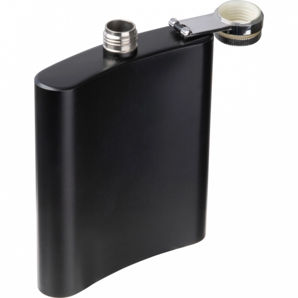 Элегантная нержавеющая стальная фляга с матовым черным дизайном и объемом 207 мл. Идеально подходит для использования в пути или в качестве стильного подарка.