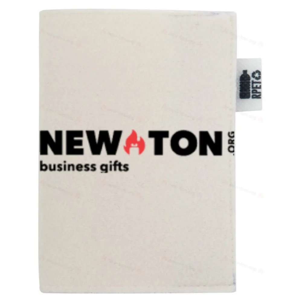 Изготовленный на заказ чехол для паспорта из RPET фетра с полноцветной печатью на обложке и застежкой на кнопке. С отличительной этикеткой из RPET. Цена включает сублимационную печать. Минимальный заказ: 50 шт.