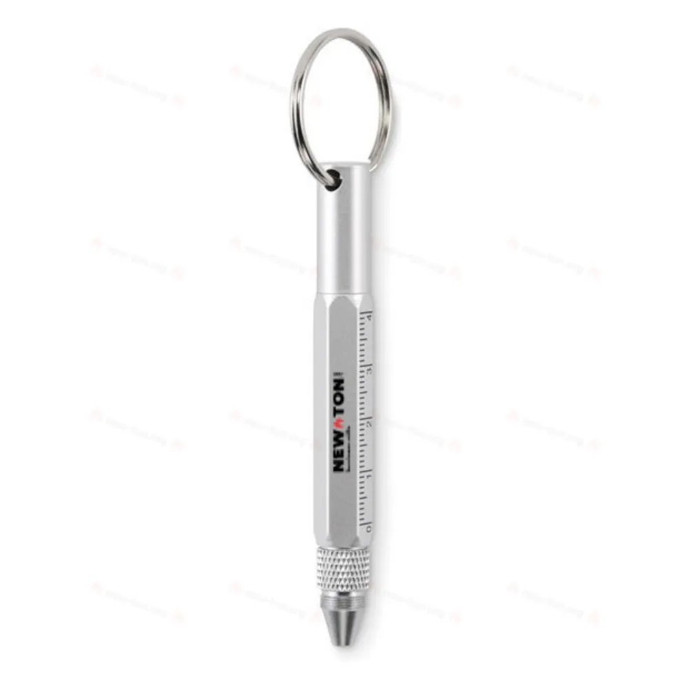 Брелок для ключей с поворотной ручкой из переработанного алюминия, линейкой на 4 см и 1,5 дюйма, стилусом и отверткой 2 в 1 с крестообразной и плоской насадками. Черные чернила.