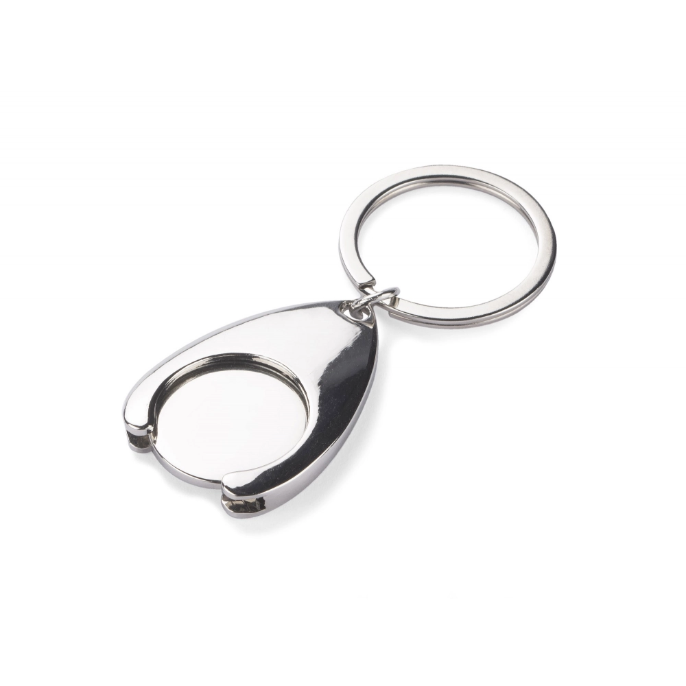 Металлический хромированный брелок с монеткой. Упакован индивидуально в черную картонную коробку. На монетке может быть выполнена гравировка логотипа.