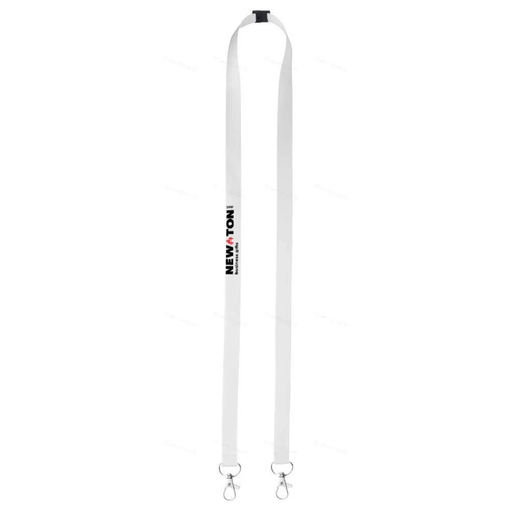 Изготовленный на заказ шнур из полиэстера шириной 15 мм с 2 металлическими карабинами и предохранительной пряжкой. С сублимационной печатью с обеих сторон. Минимальный заказ: 100 шт.