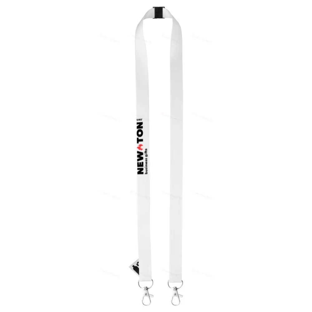 Изготовленный на заказ шнурок из RPET с 2 металлическими карабинами и предохранительной пряжкой. С сублимационной печатью с обеих сторон. Минимальный заказ: 100 шт.