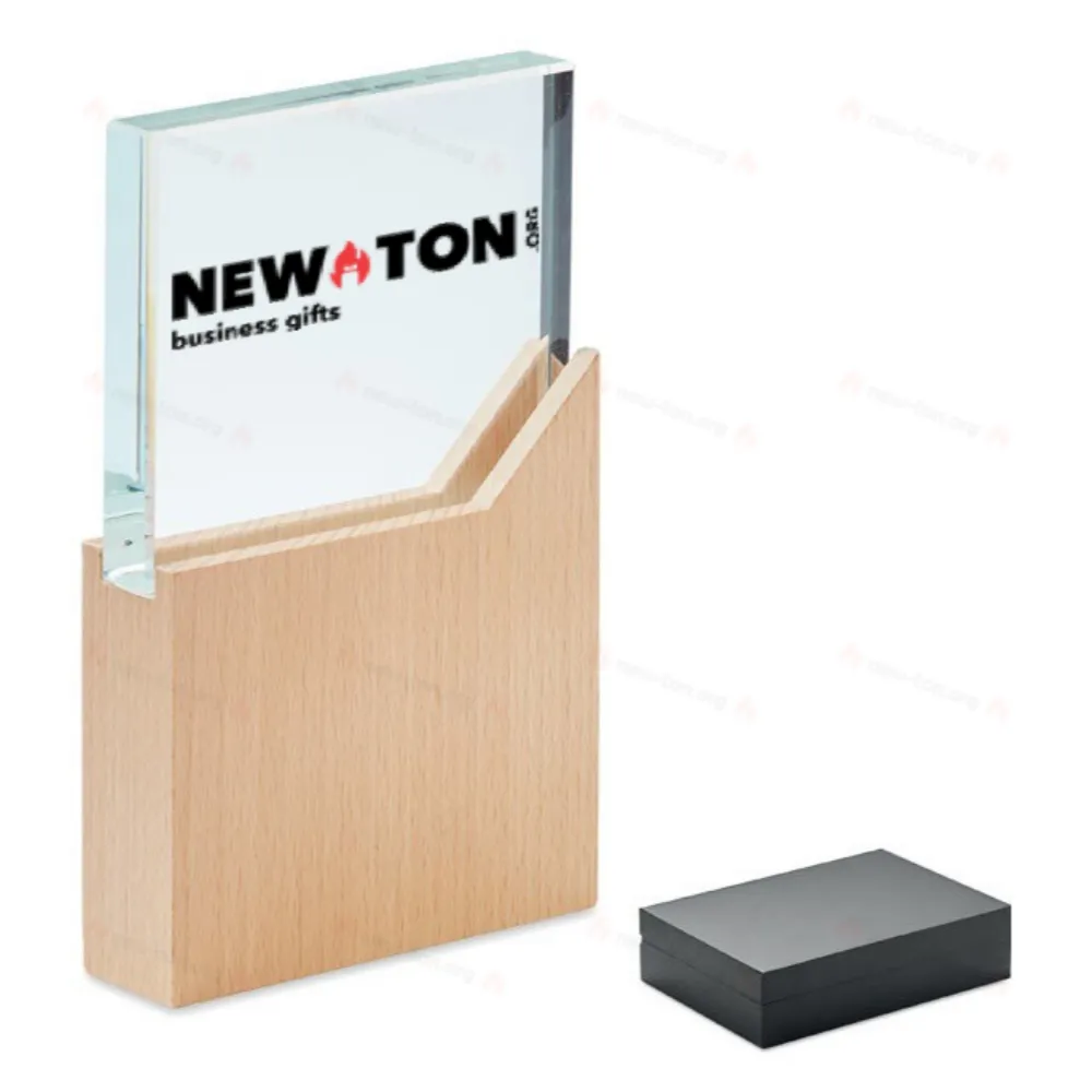 Хрустальная награда или наградная табличка на деревянном основании из бука в подарочной коробке.