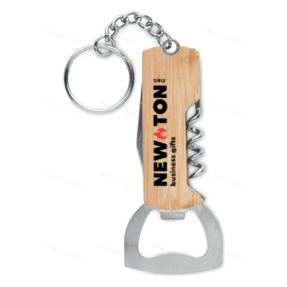 Брелок для ключей 3 в 1 в бамбуковым корпусе. В него входят открывалка для бутылок, штопор для вина и перочинный нож.