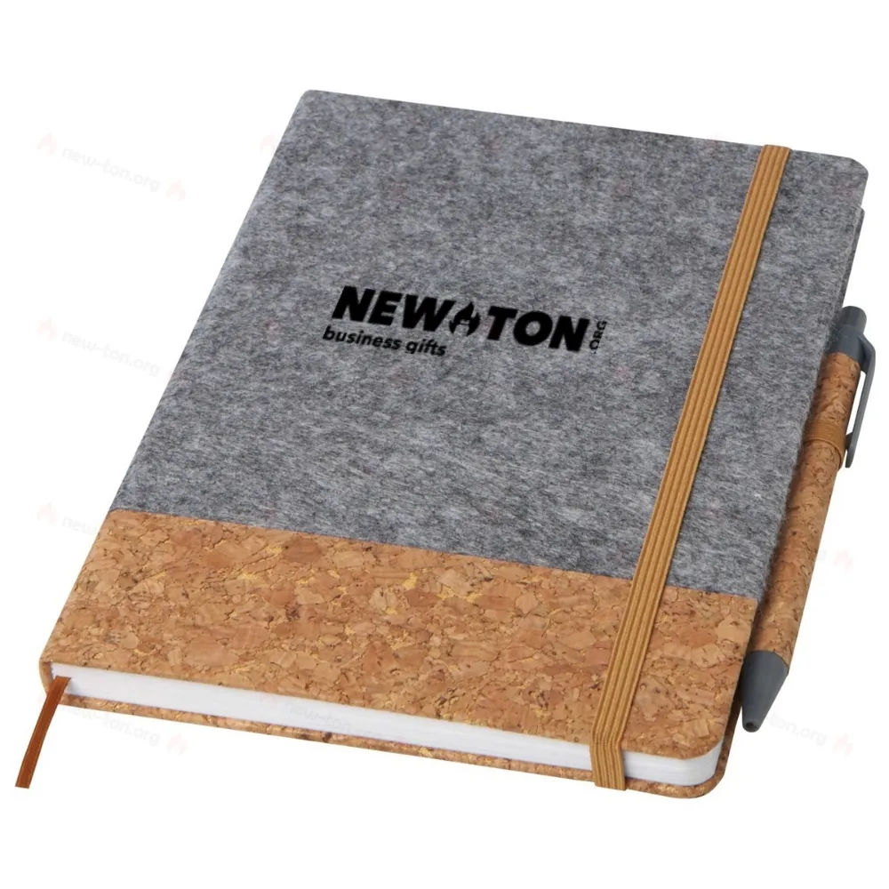 Блокнот в твердой обложке формата A5 изготовлен из пробки и переработанного фетра, содержит 80 линованных листов бумаги плотностью 70 г/м², оснащен эластичной застежкой, закладкой-ленточкой и петлей для ручки. Кнопка, клип и наконечник шариковой ручки выполнены из переработанного пластика, а корпус - из пробки. Чернила ручки: черные. Длина письма: 600 метров. Размер пера: 1,0 мм.