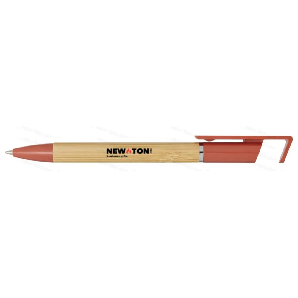 Бамбуковая шариковая ручка, которая также служит держателем для телефона. Кнопка и среднее кольцо изготовлены из переработанного пластика, наконечник - из латуни, а корпус - из экологически чистого бамбука. Цвет чернил: черный. Длина письма: 1000 метров. Размер пера: 1,0 мм.