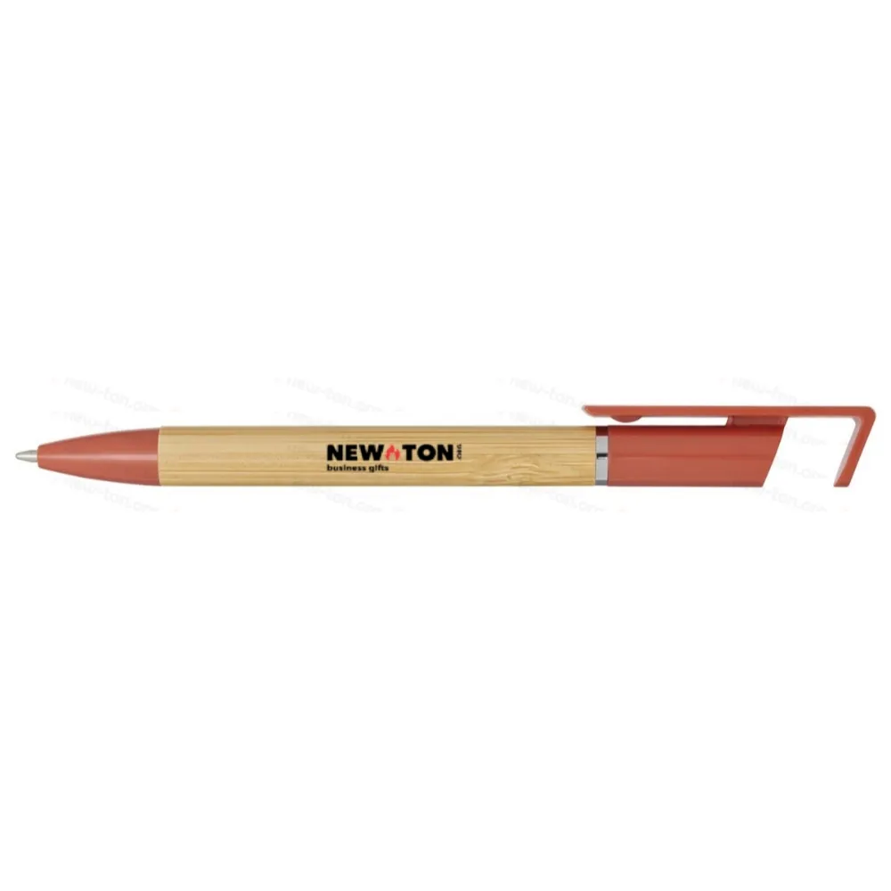 Бамбуковая шариковая ручка, которая также может использоваться как держатель для телефона. Кнопка и среднее кольцо изготовлены из переработанного пластика, наконечник - из латуни, а корпус - из экологически чистого бамбука. Цвет чернил: синий. Длина письма: 1000 метров. Размер пера: 1,0 мм.