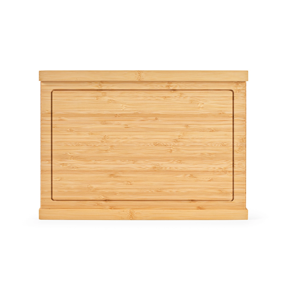 Это выдающаяся бамбуковая доска. Размеры 28 x 39 x 4,5 см, с канавкой по периметру, она скрывает секрет - выдвижной лоток с тремя кухонными ножами. Поставляется в индивидуальной коробке из переработанного картона.