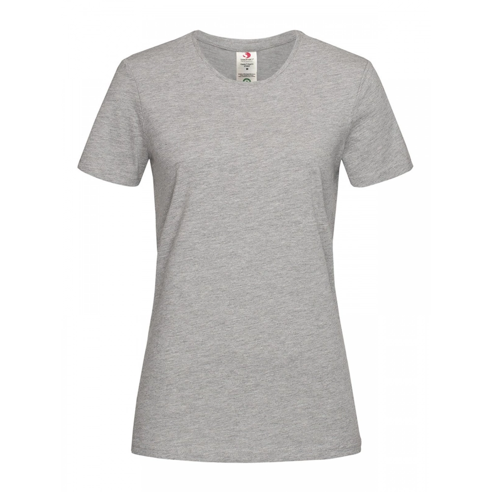 Женская футболка с короткими рукавами из 100% органического хлопка кольцевого прядения, сертифицированного по стандарту OCS, одинарный трикотаж. Воротник из той же ткани, усиленные швы на плечах, лента на шее, боковые швы. Цвет GYH: 85% хлопок, 15% вискоза.