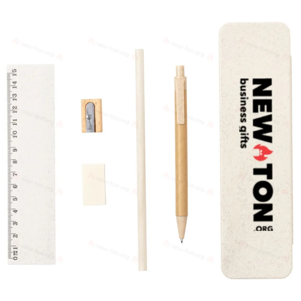 Набор из 5 предметов для письма в экологичном пластиковом чехле из пшеничной соломы. Включает в себя деревянный карандаш, переработанную бумагу и ручку синего цвета из пшеничной соломы с синим стержнем, линейку 15 см, деревянную точилку и ластик.