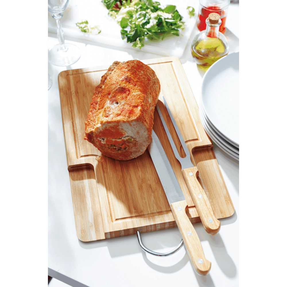 Разделочная доска BAMBOO-CUT: включает набор для резки, нож и вилку из нержавеющей стали с деревянной ручкой, прорези в доске для безопасного хранения столовых приборов, бамбуковая доска с практичным металлическим подвесом