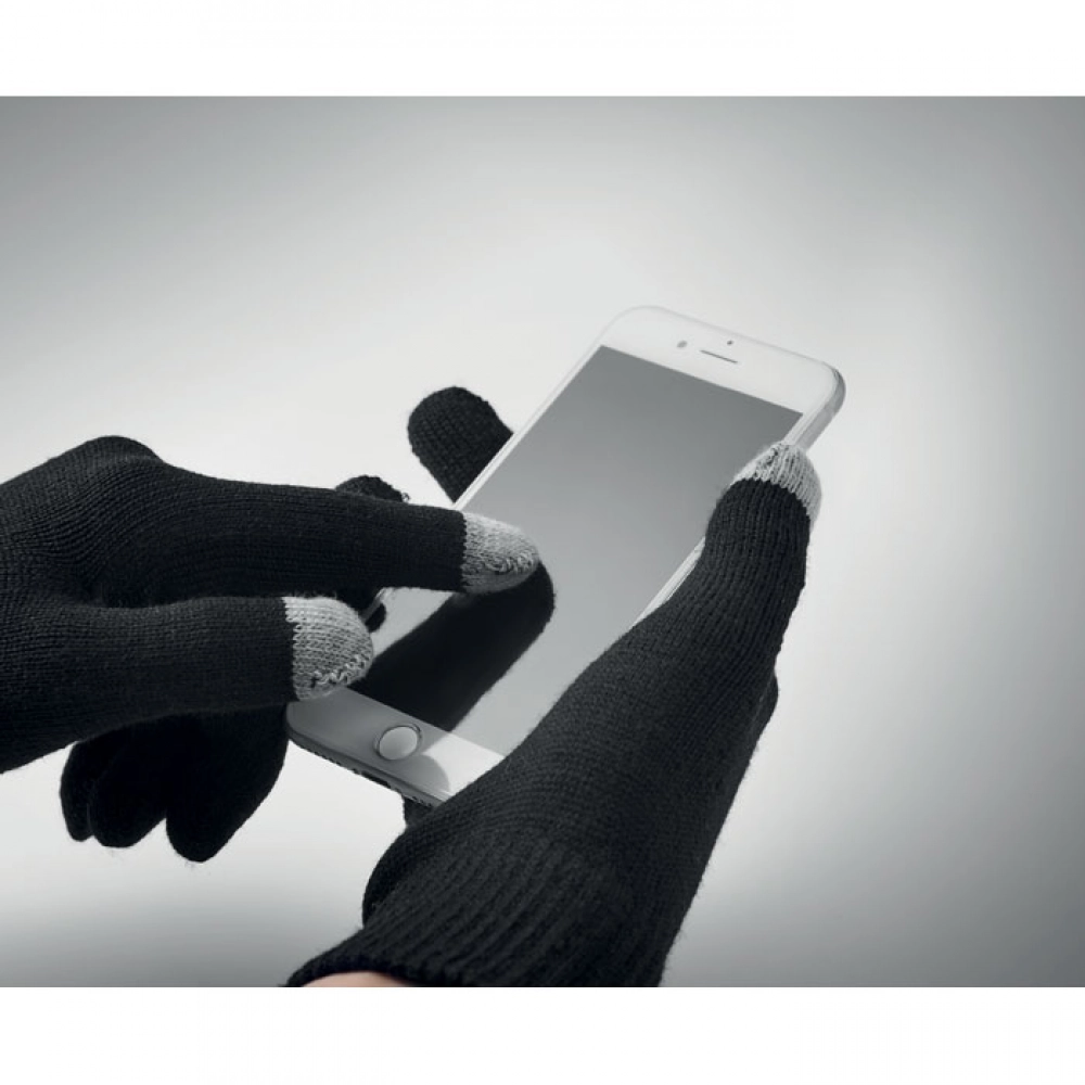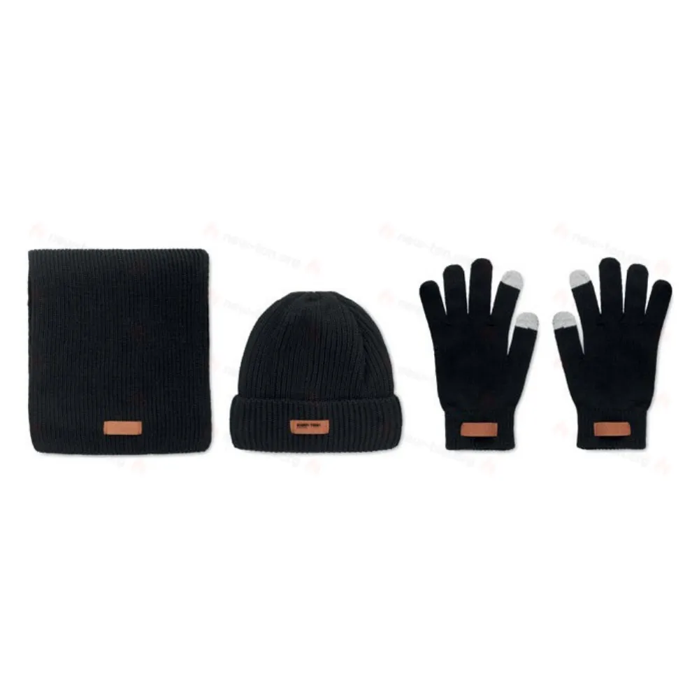 Зимний комплект из 3 предметов. Включает в себя шапочку из переработанного материала, шарф и тактильные перчатки с нашивкой для нанесения.