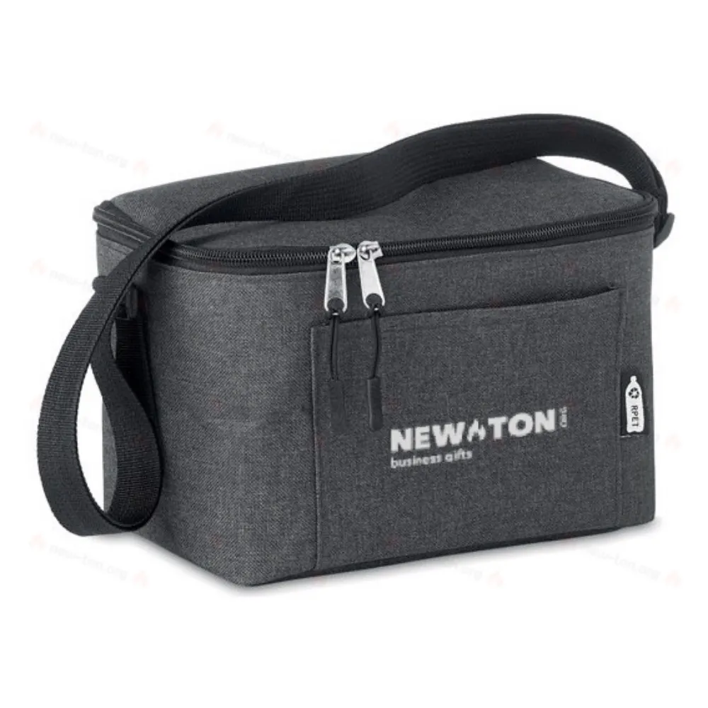 Сумка холодильник с фронтальным карманом на 6 банок в двухцветном RPET 600D. Изоляционный материал: ПЭВА 0,15 мм + пена 3 мм.