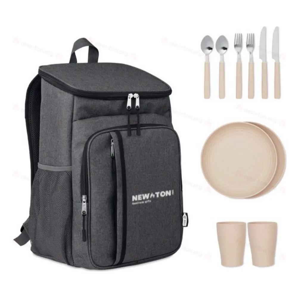 Рюкзак - холодильник или термо рюкзак для пикника. Двухцветный 600D из RPET. В комплекте столовые принадлежности на 2 персоны. Все приборы из нержавеющей стали. В комплекте 2 вилки, ложки и 2 стакана из смесевого материала 70% пшеничной соломы и 30% полипропилена.