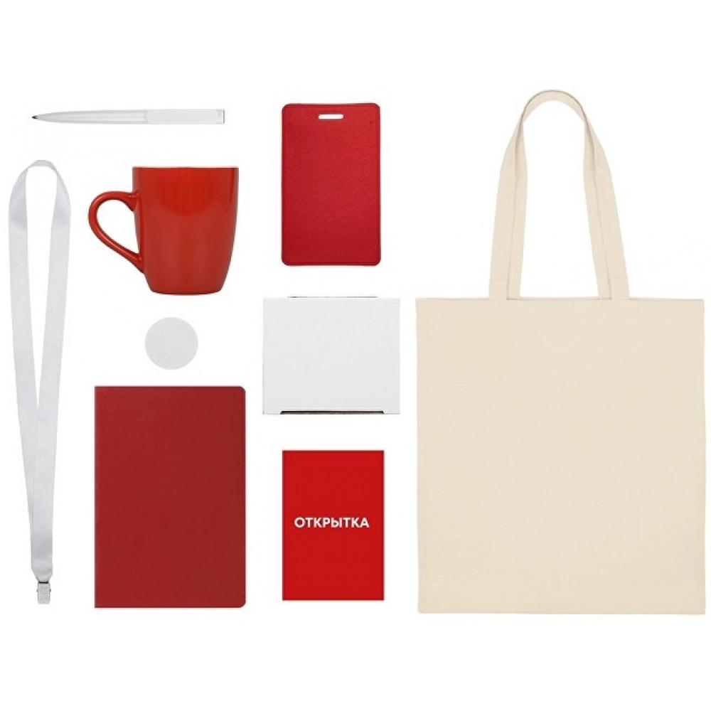 шоппер- 100% хлопок, блокнот и чехол- искусственная кожа, ручка и держатель- пластик, кружка- керамика, ланъярд- RPET, открытка- бумага
