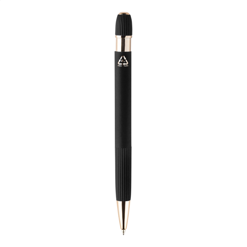Recycled aluminium ballpoint pen with rubberized body and rose gold details. With special coating for mirror laser engraving in rose gold colour. With blue refill.