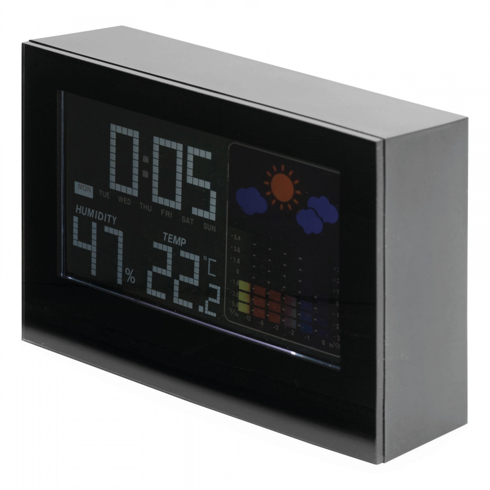 Weather station COLOUR with alarm function, date and time display, hygrometer and thermometer (for °C and °F), lit up LCD screen - black display with coloured elements and connection for an adapter (adapter excluded)